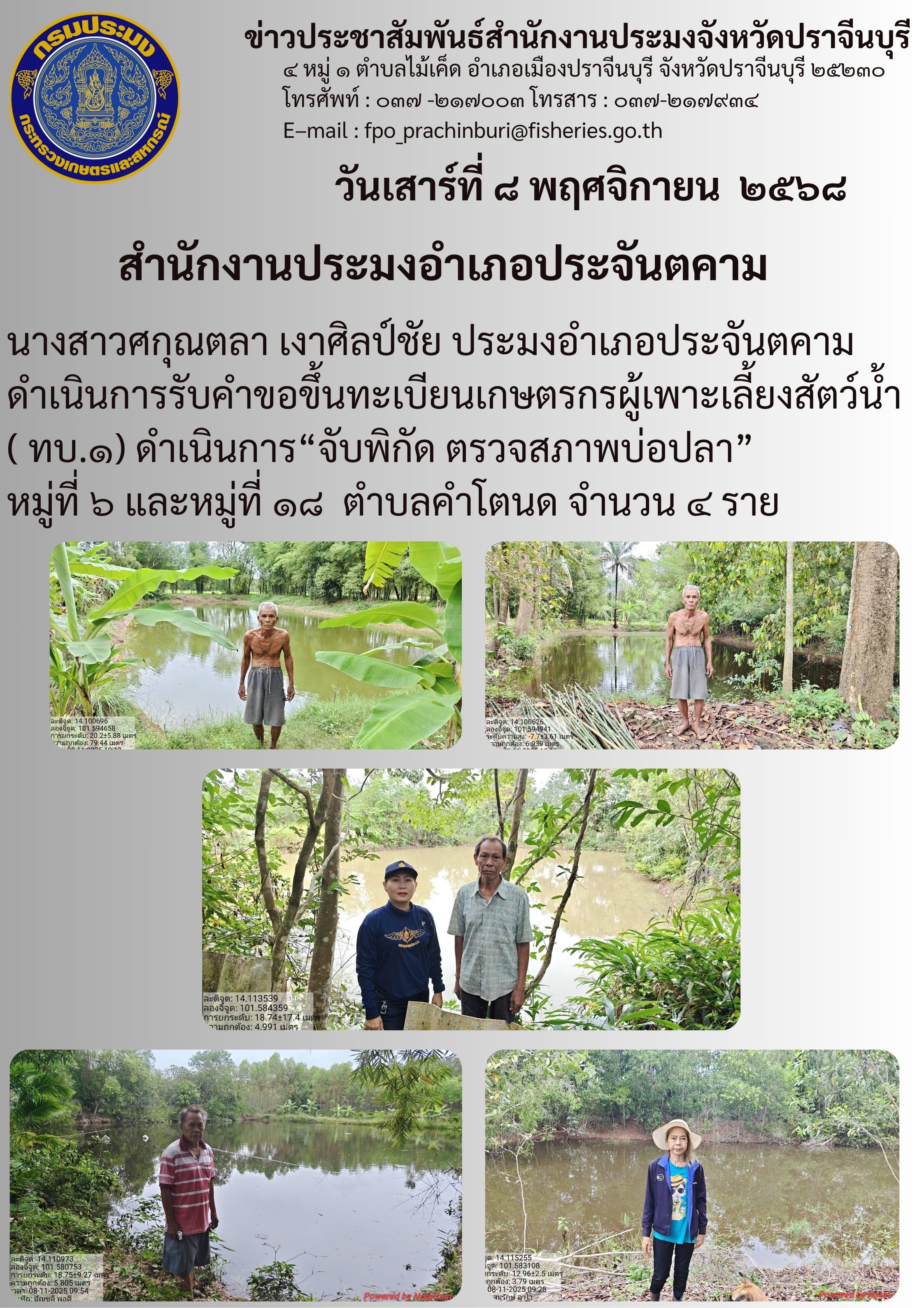 ข่าวประชาสัมพันธ์ สำนักงานประมงอำเภอประจันตคาม ดำเนินการรับคำขอขึ้นทะเบียนเกษตรกรผู้เพาะเลี้ยงสัตว์น้ำ (ทบ.๑)