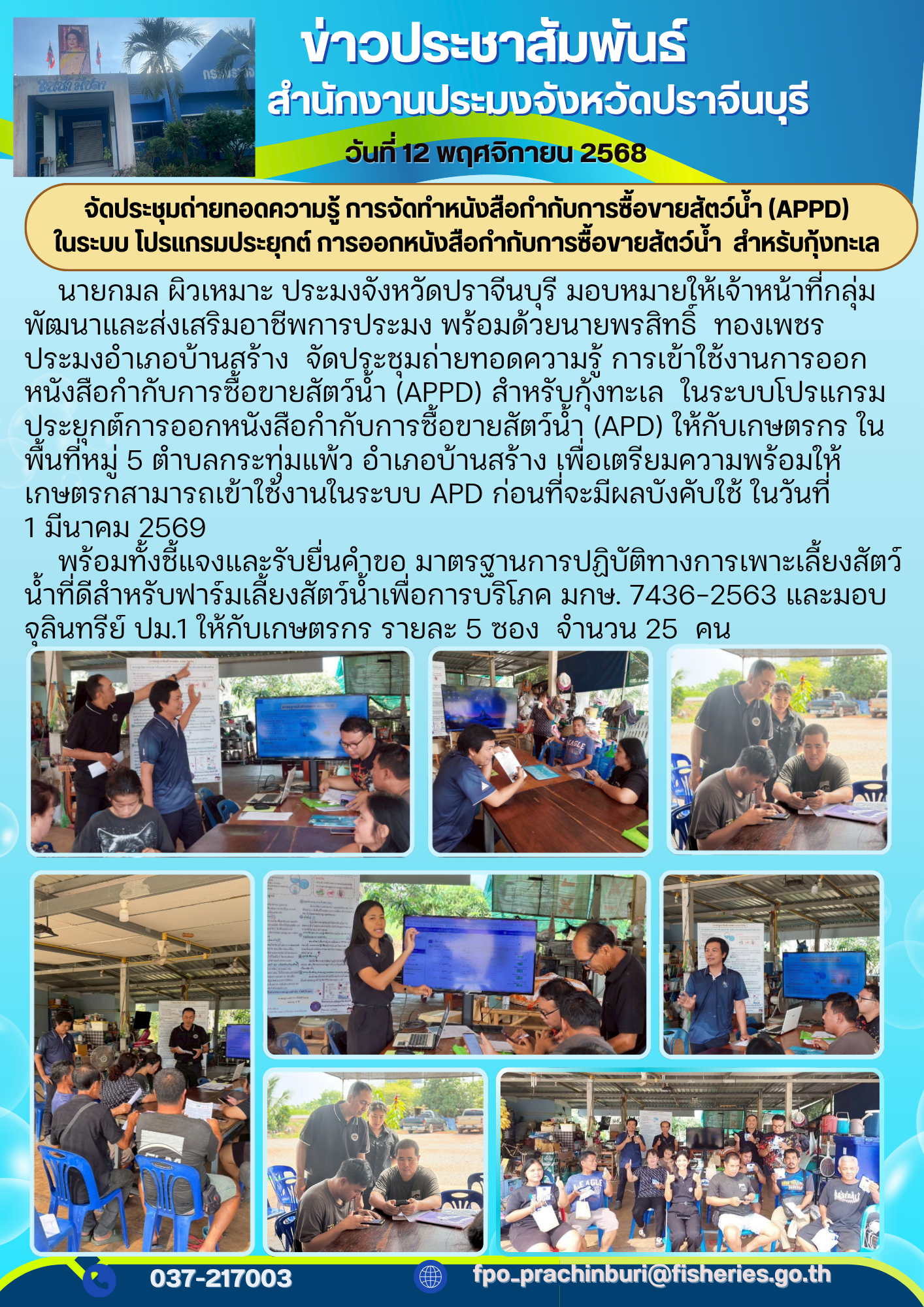 ข่าวประชาสัมพันธ์ จัดประชุมถ่ายทอดความรู้ การเข้าใช้งานการออก หนังสือกำกับการซื้อขายสัตว์น้ำ (APPD) สำหรับกุ้งทะเล ในระบบโปรแกรม ประยุกต์การออกหนังสือกำกับการซื้อขายสัตว์น้ำ (APD)