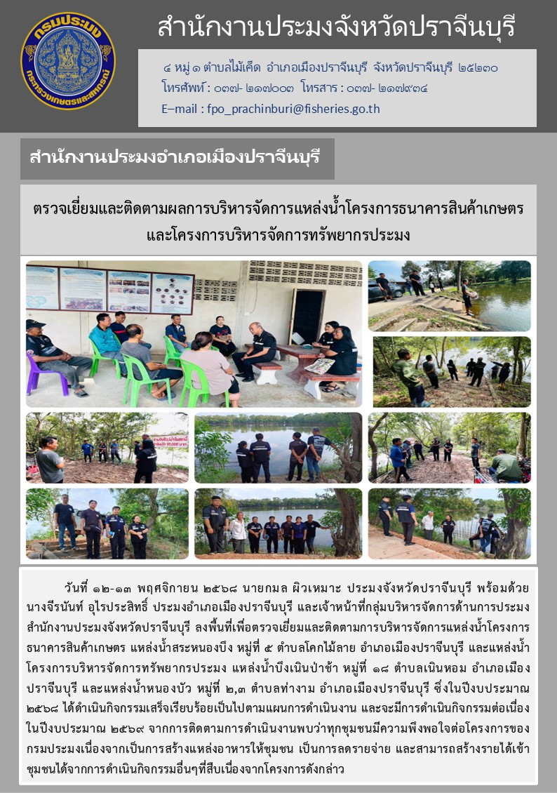 ข่าวประชาสัมพันธ์ สำนักงานประมงอำเภอเมืองปราจีนบุรี ลงพื้นที่เพื่อตรวจเยี่ยมและติดตามการบริหารจัดการแหล่งน้ำโครงการ ธนาคารสินค้าเกษตร แหล่งน้ำสระหนองบึง