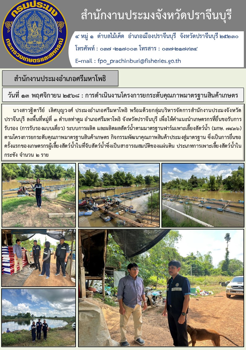 ข่าวประชาสัมพันธ์ สำนักงานประมงอำเภอศรีมหาโพธิ ลงพื้นที่หมู่ที่ ๓ ตำบลท่าตูม อำเภอศรีมหาโพธิ จังหวัดปราจีนบุรี เพื่อให้คำแนะนำเกษตรกรที่ยื่นขอรับการ รับรอง (การรับรองแบบเดี่ยว) ระบบการผลิต และผลิตผลสัตว์น้ำตามมาตรฐานฟาร์มเพาะเลี้ยงสัตว์น้ำ (มกษ. ๗๔๓๖)