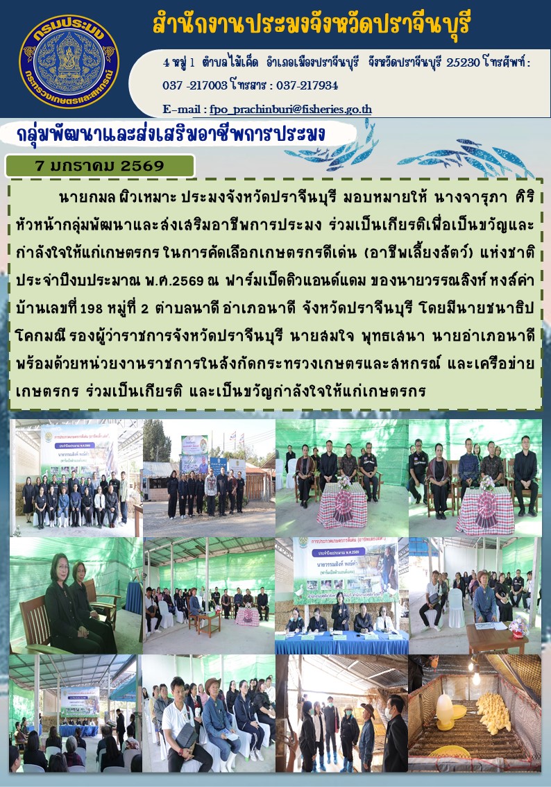 ข่าวประชาสัมพันธ์ กลุ่มพัฒนาและส่งเสริมอาชีพการประมง ร่วมเป็นเกียรติเพื่อเป็นขวัญ และกำาลังใจให้แก่เกษตรกร ในการคัดเลือกเกษตรกรดีเด่น (อาชีพเลี้ยงสัตว์) แห่งชาติ ประจําปีงบประมาณ พ.ศ.2569
