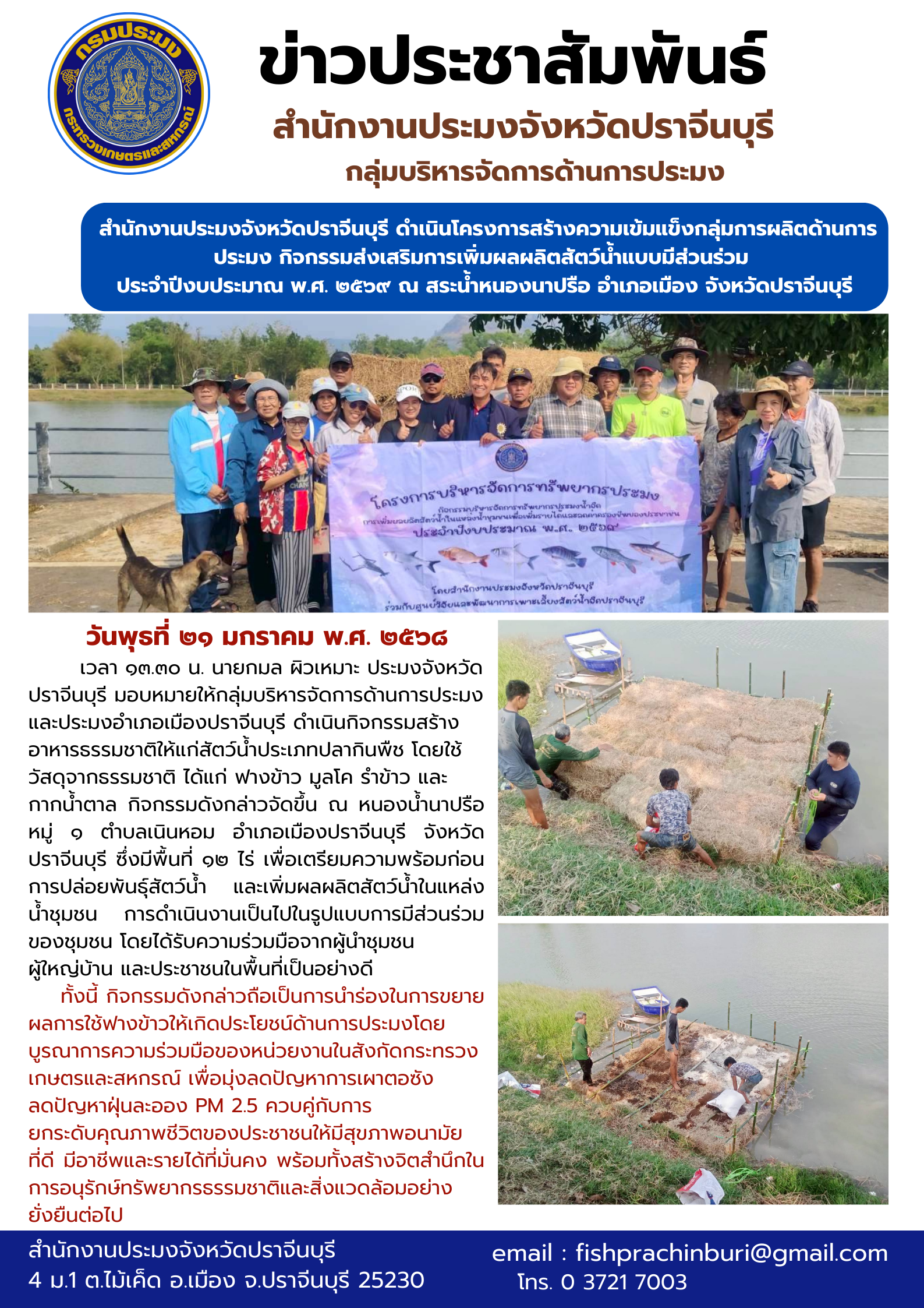 ข่าวประชาสัมพันธ์ กลุ่มบริหารจัดการด้านการประมง โครงการสร้างความเข้มแข็งกลุ่มการผลิตด้านการ ประมง กิจกรรมส่งเสริมการเพิ่มผลผลิตสัตว์น้ำแบบมีส่วนร่วม ประจําปีงบประมาณ พ.ศ. ๒๕๖๙ ณ สระน้ำหนองนาปรือ อำเภอเมือง จังหวัดปราจีนบุรี