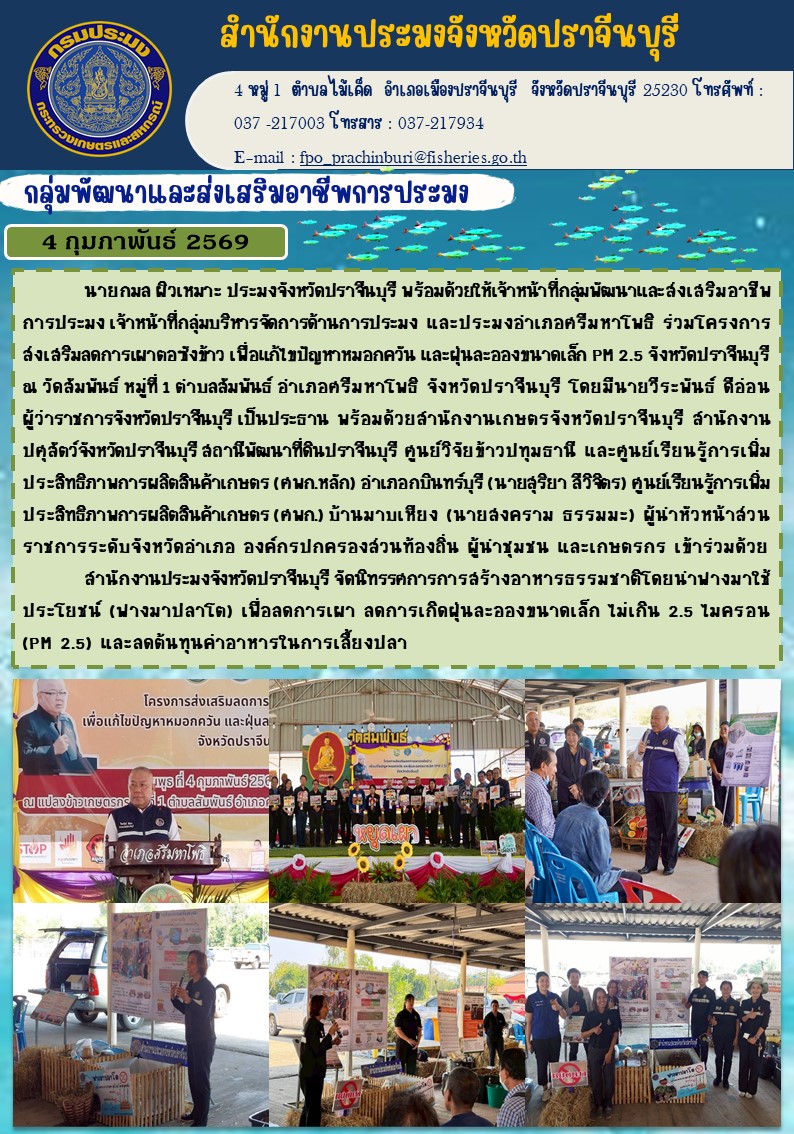 ข่าวประชาสัมพันธ์ กลุ่มพัฒนาและส่งเสริมอาชีพการประมง ร่วมโครงการ ส่งเสริมลดการเผาตอซังข้าว เมื่อแก้ไขปัญหาหมอกควัน และฝุ่นละอองขนาดเล็ก PM 2.5 จังหวัดปราจีนบุรี