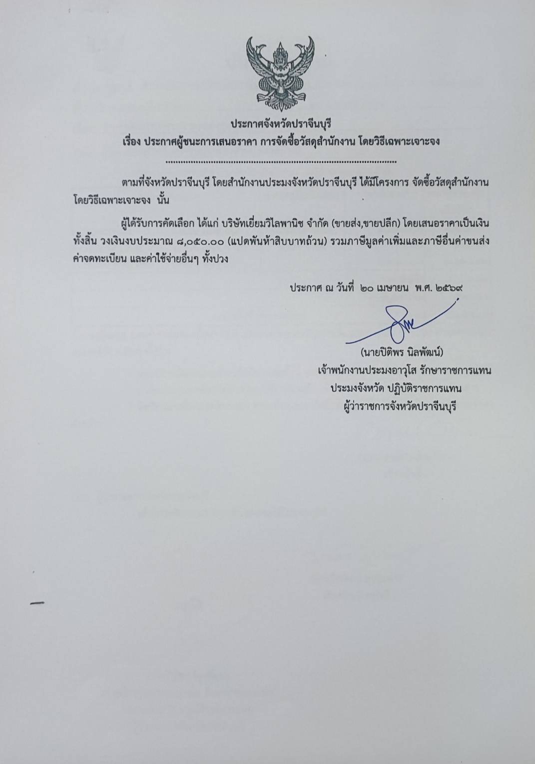 ประกาศผู้ชนะการเสนอราคา การจัดซื้อวัสดุสำนักงาน โดยวิธีเฉพาะเจาะจง