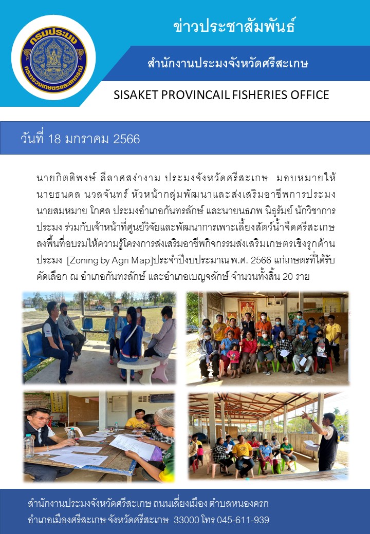 นายกิตติพงษ์ ลีลาศสง่างาม ประมงจังหวัดศรีสะเกษ มอบหมายให้ นายธนดล นวลจันทร์ หัวหน้ากลุ่มพัฒนาและส่งเสริมอาชีพการประมง นายสมหมาย โกศล ประมงอำเภอกันทรลักษ์ และนายนธภพ นิธุรัมย์ นักวิชาการประมง ร่วมกับเจ้าหน้าที่ศูนย์วิจัยและพัฒนาการเพาะเลี้ยงสัตว์น้ำจืดศรีสะเกษ ลงพื้นที่อบรมให้ความรู้โครงการส่งเสริมอาชีพกิจกรรมส่งเสริมเกษตรเชิงรุกด้านประมง [Zoning by Agri Map]ประจำปีงบประมาณ พ.ศ. 2566 แก่เกษตรที่ได้รับคัดเลือก ณ อำเภอกันทรลักษ์ และอำเภอเบญจลักษ์ จำนวนทั้งสิ้น 20 ราย