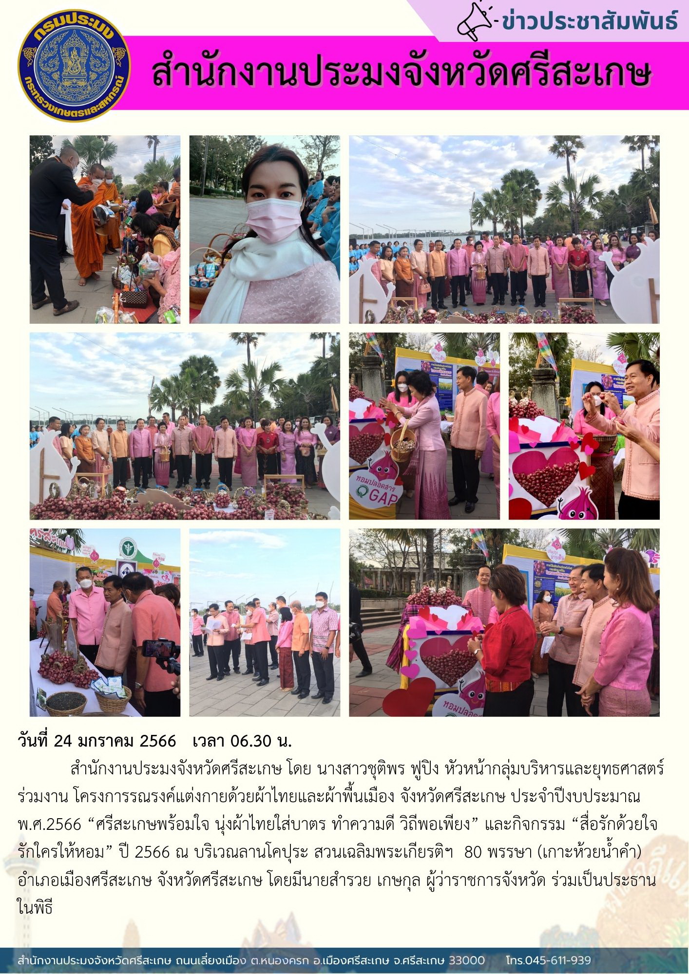 สำนักงานประมงจังหวัดศรีสะเกษ โดย นางสาวชุติพร ฟูปิง  หัวหน้ากลุ่มบริหารและยุทธศาสตร์ ร่วมงาน โครงการรณรงค์แต่งกายด้วยผ้าไทยและผ้าพื้นเมือง จังหวัดศรีสะเกษ ประจำปีงบประมาณ พ.ศ.2566 “ศรีสะเกษพร้อมใจ นุ่งผ้าไทยใส่บาตร ทำความดี วิถีพอเพียงและกิจกรรม สื่อรักด้วยใจ รักใครให้หอมปี 2566 ณ บริเวณลานโคปุระ   สวนเฉลิมพระเกียรติฯ  80 พรรษา (เกาะห้วยน้ำคำ) อำเภอเมืองศรีสะเกษ จังหวัดศรีสะเกษ โดยมีนายสำรวย เกษกุล ผู้ว่าราชการจังหวัด ร่วมเป็นประธานในพิธี