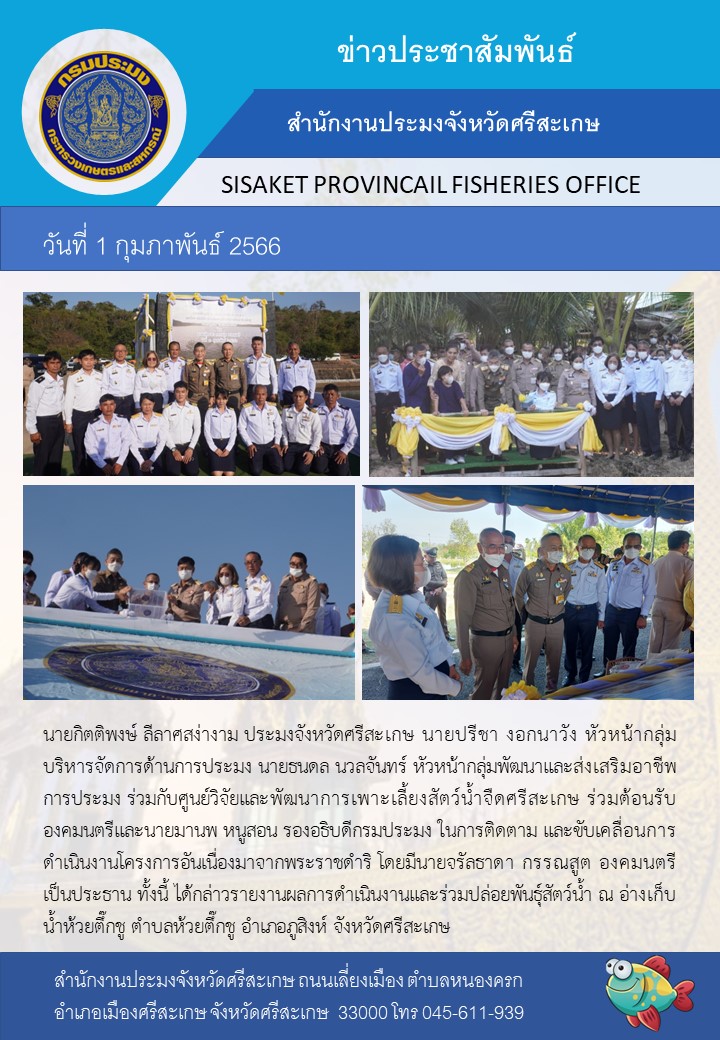 นายกิตติพงษ์ ลีลาศสง่างาม ประมงจังหวัดศรีสะเกษ นายปรีชา งอกนาวัง หัวหน้ากลุ่มบริหารจัดการด้านการประมง นายธนดล นวลจันทร์ หัวหน้ากลุ่มพัฒนาและส่งเสริมอาชีพการประมง ร่วมกับศูนย์วิจัยและพัฒนาการเพาะเลี้ยงสัตว์น้ำจืดศรีสะเกษ ร่วมต้อนรับองคมนตรีและนายมานพ หนูสอน รองอธิบดีกรมประมง ในการติดตาม และขับเคลื่อนการดำเนินงานโครงการอันเนื่องมาจากพระราชดำริ โดยมีนายจรัลธาดา กรรณสูต องคมนตรี เป็นประธาน
