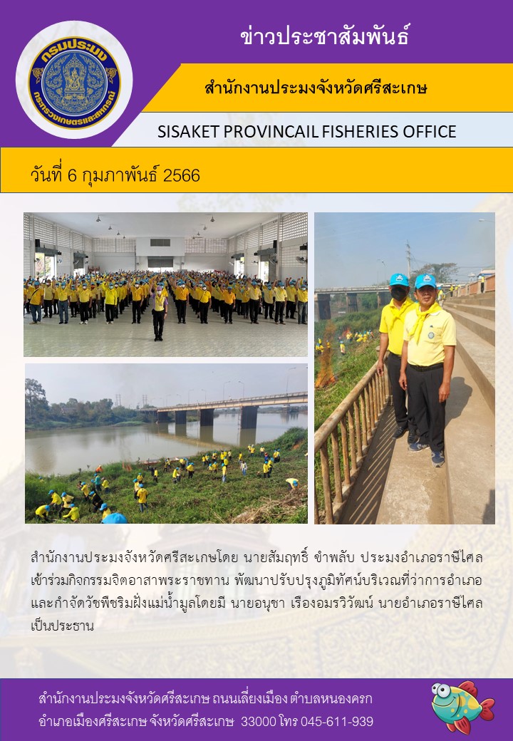 สำนักงานประมงจังหวัดศรีสะเกษโดย นายสัมฤทธิ์ ขำพลับ ประมงอำเภอราษีไศล เข้าร่วมกิจกรรมจิตอาสาพระราชทาน พัฒนาปรับปรุงภูมิทัศน์บริเวณที่ว่าการอำเภอ และกำจัดวัชพืชริมฝั่งแม่น้ำมูลโดยมี นายอนุชา เรืองอมรวิวัฒน์ นายอำเภอราษีไศล เป็นประธาน