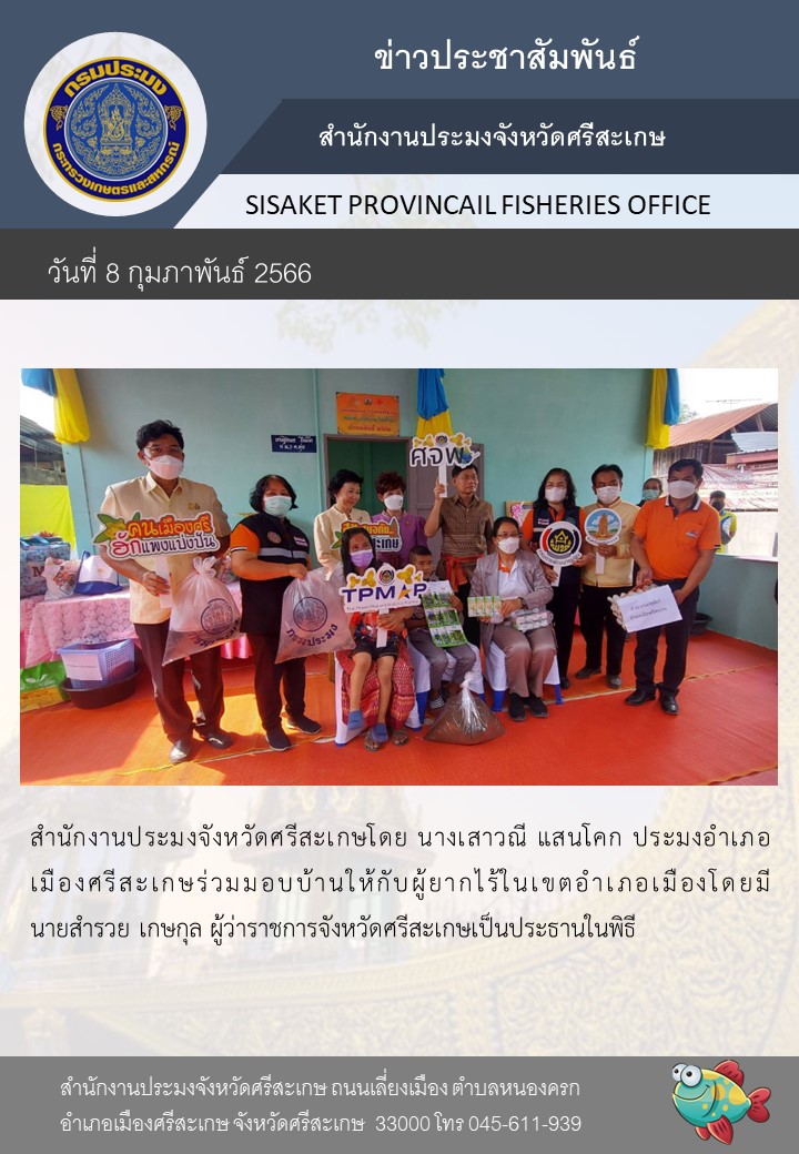 สำนักงานประมงจังหวัดศรีสะเกษโดย นางเสาวณี แสนโคก ประมงอำเภอเมืองศรีสะเกษ ร่วมมอบบ้านให้กับผู้ยากไร้ในเขตอำเภอเมือง โดยมี นายสำรวย เกษกุล ผู้ว่าราชการจังหวัดศรีสะเกษ เป็นประธานในพิธี