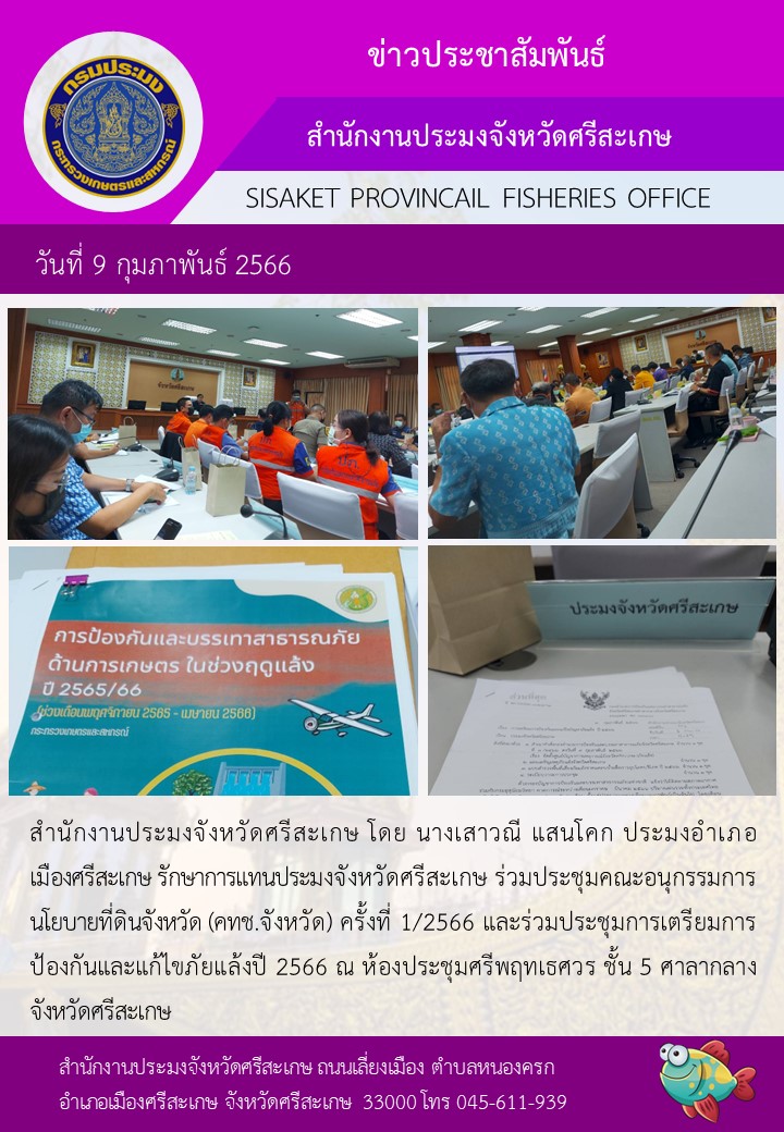 สำนักงานประมงจังหวัดศรีสะเกษ โดย นางเสาวณี แสนโคก ประมงอำเภอเมืองศรีสะเกษ รักษาราชการแทนประมงจังหวัดศรีสะเกษ ร่วมประชุมคณะอนุกรรมการนโยบายที่ดินจังหวัด (คทช.จังหวัด) ครั้งที่ 1/2566 และร่วมประชุมการเตรียมการป้องกันและแก้ไขภัยแล้งปี 2566 ณ ห้องประชุมศรีพฤทเธศวร ชั้น 5 ศาลากลางจังหวัดศรีสะเกษ