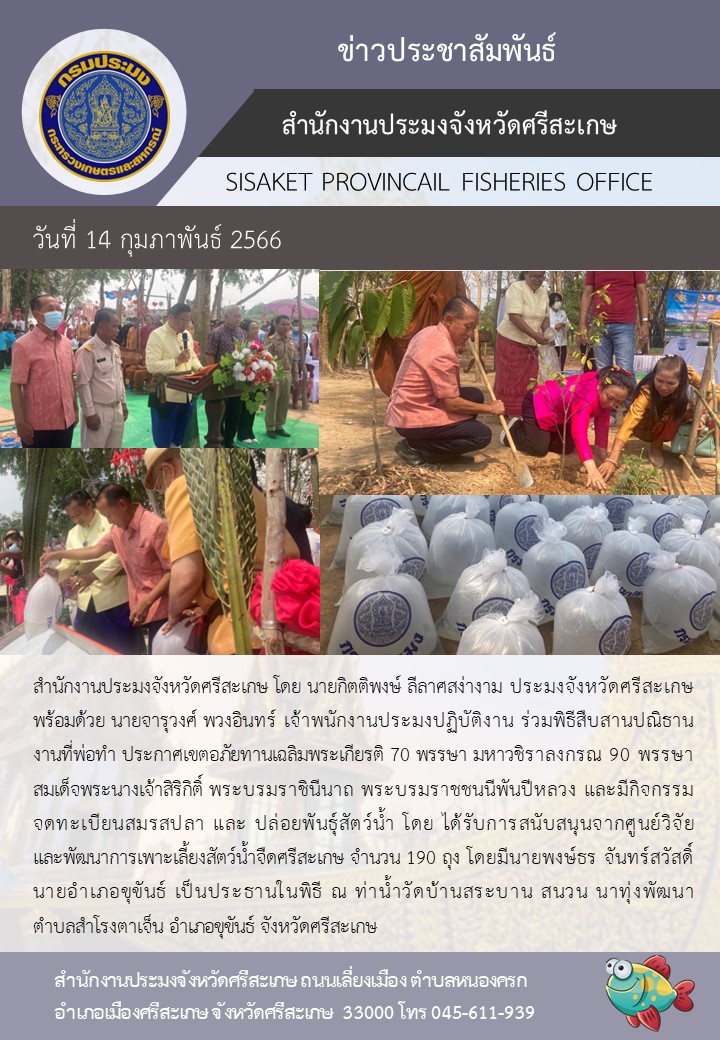 สำนักงานประมงจังหวัดศรีสะเกษ โดย นายกิตติพงษ์ ลีลาศสง่างาม ประมงจังหวัดศรีสะเกษ พร้อมด้วย นายจารุวงศ์ พวงอินทร์ เจ้าพนักงานประมงปฏิบัติงาน ร่วมพิธีสืบสานปณิธานงานที่พ่อทำ ประกาศเขตอภัยทานเฉลิมพระเกียรติ 70 พรรษา มหาวชิราลงกรณ 90 พรรษา สมเด็จพระนางเจ้าสิริกิติ์ พระบรมราชินีนาถ พระบรมราชชนนีพันปีหลวง และมีกิจกรรมจดทะเบียนสมรสปลา และ ปล่อยพันธุ์สัตว์น้ำ โดย ได้รับการสนับสนุนจากศูนย์วิจัยและพัฒนาการเพาะเลี้ยงสัตว์น้ำจืดศรีสะเกษ จำนวน 190 ถุง โดยมีนายพงษ์ธร จันทร์สวัสดิ์ นายอำเภอขุขันธ์ เป็นประธานในพิธี ณ ท่าน้ำวัดบ้านสระบานสนวนนาทุ่งพัฒนา ตำบลสำโรงตาเจ็น อำเภอขุขันธ์ จังหวัดศรีสะเกษ