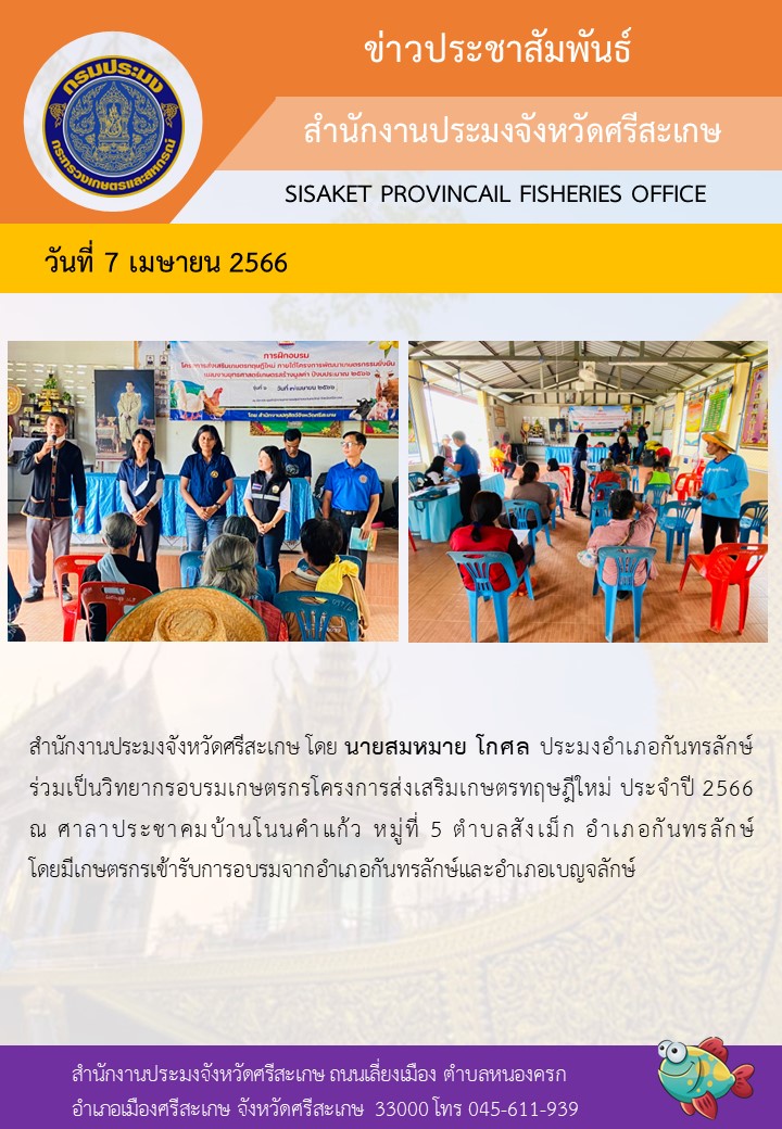 สำนักงานประมงจังหวัดศรีสะเกษ โดย นายสมหมาย โกศล ประมงอำเภอกันทรลักษ์ ร่วมเป็นวิทยากรอบรมเกษตรกรโครงการส่งเสริมเกษตรทฤษฎีใหม่ ประจำปี 2566 ณ ศาลาประชาคมบ้านโนนคำแก้ว หมู่ที่ 5 ตำบลสังเม็ก อำเภอกันทรลักษ์ โดยมีเกษตรกรเข้ารับการอบรมจากอำเภอกันทรลักษ์และอำเภอเบญจลักษ์