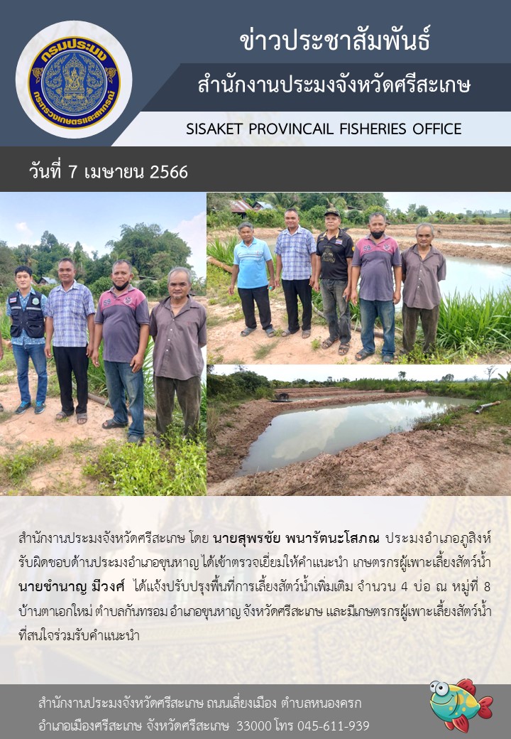 สำนักงานประมงจังหวัดศรีสะเกษ โดย นายสุพรชัย พนารัตนะโสภณ ประมงอำเภอภูสิงห์ รับผิดชอบด้านประมงอำเภอขุนหาญ ได้เข้าตรวจเยี่ยมให้คำแนะนำ เกษตรกรผู้เพาะเลี้ยงสัตว์น้ำ นายชำนาญ มีวงศ์ ได้แจ้งปรับปรุงพื้นที่การเลี้ยงสัตว์น้ำเพิ่มเติม จำนวน 4 บ่อ ณ หมู่ที่ 8 บ้านตาเอกใหม่ ตำบลกันทรอม อำเภอขุนหาญ จังหวัดศรีสะเกษ และมีเกษตรกรผู้เพาะเลี้ยงสัตว์น้ำที่สนใจร่วมรับคำแนะนำ