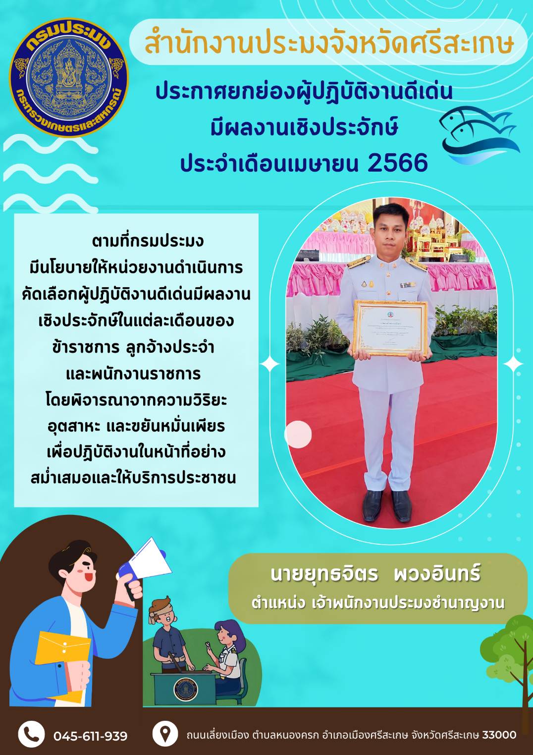 ตามที่กรมประมง มีนโยบายให้หน่วยงานดำเนินการคัดเลือกผู้ปฏิบัติงานดีเด่นมีผลงาน    เชิงประจักษ์ในแต่ละเดือนของข้าราชการ ลูกจ้างประจำ และพนักงานราชการ ประจำเดือนเมษายน 2566 โดยพิจารณาจากความวิริยะ อุตสาหะ และขยันหมั่นเพียรเพื่อปฏิบัติงานในหน้าที่อย่างสม่ำเสมอและให้บริการประชาชน ได้แก่