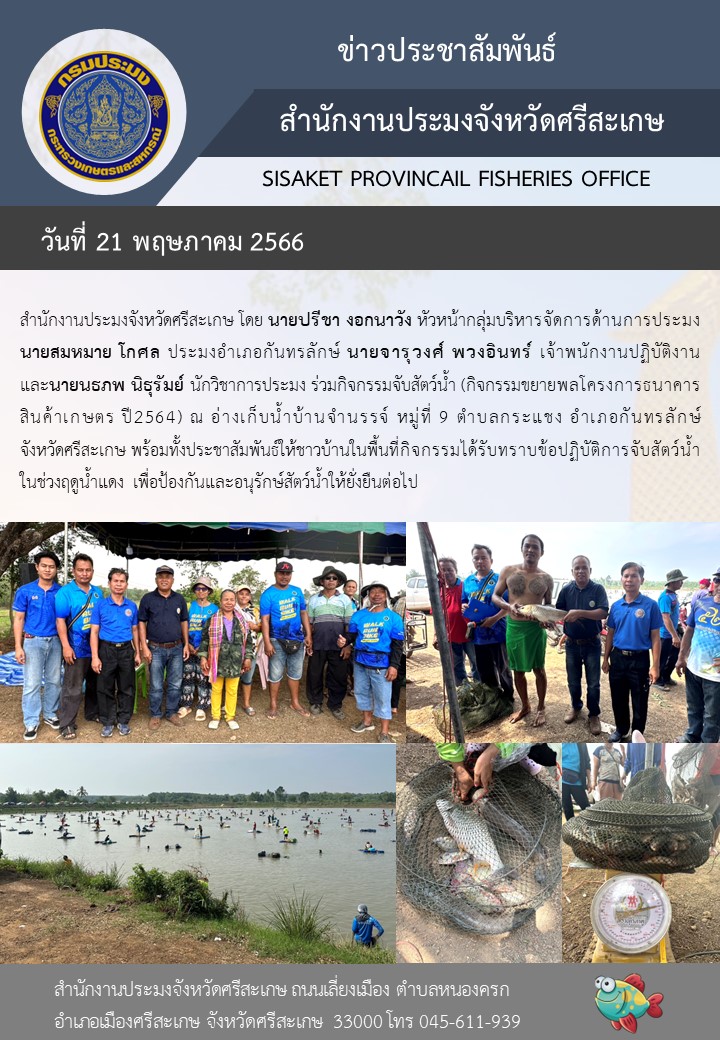 สำนักงานประมงจังหวัดศรีสะเกษ โดย นายปรีชา งอกนาวัง หัวหน้ากลุ่มบริหารจัดการด้านการประมง นายสมหมาย โกศล ประมงอำเภอกันทรลักษ์ นายจารุวงศ์ พวงอินทร์ เจ้าพนักงานปฏิบัติงาน และนายนธภพ นิธุรัมย์ นักวิชาการประมง ร่วมกิจกรรมจับสัตว์น้ำ (กิจกรรมขยายผลโครงการธนาคารสินค้าเกษตร ปี2564) ณ อ่างเก็บน้ำบ้านจำนรรจ์ หมู่ที่ 9 ตำบลกระแชง อำเภอกันทรลักษ์ จังหวัดศรีสะเกษ พร้อมทั้งประชาสัมพันธ์ให้ชาวบ้านในพื้นที่กิจกรรมได้รับทราบข้อปฏิบัติการจับสัตว์น้ำในช่วงฤดูน้ำแดง เพื่อป้องกันและอนุรักษ์สัตว์น้ำให้ยั่งยืนต่อไป