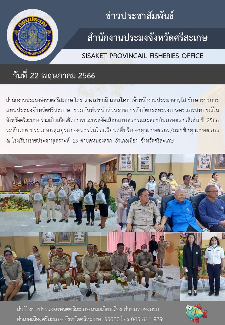 สำนักงานประมงจังหวัดศรีสะเกษ โดย นางเสาวณี แสนโคก เจ้าพนักงานประมงอาวุโส รักษาราชการแทนประมงจังหวัดศรีสะเกษ ร่วมกับหัวหน้าส่วนราชการสังกัดกระทรวงเกษตรและสหกรณ์ในจังหวัดศรีสะเกษ ร่วมเป็นเกียรติในการประกวดคัดเลือกเกษตรกรและสถาบันเกษตรกรดีเด่น ปี 2566 ระดับเขต ประเภทกลุ่มยุวเกษตรกรในโรงเรียน/ที่ปรึกษายุวเกษตรกร/สมาชิกยุวเกษตรกร ณ โรงเรียนราชประชานุเคราะห์ 29 ตำบลหนองครก อำเภอเมือง จังหวัดศรีสะเกษ