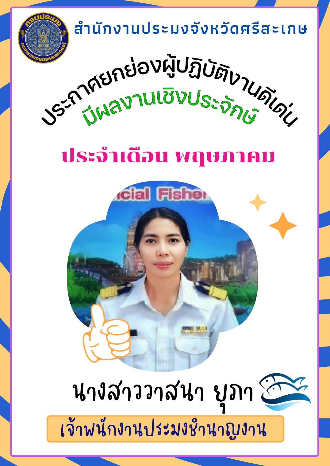 สำนักงานประมงจังหวัดศรีสะเกษ ขอยกย่อง "นางสาววาสนา ยุภา" พนักงานประมงชำนาญงาน ผู้ปฏิบัติงานดีเด่น มีผลงานเชิงประจักษ์ ประจำเดือนพฤษภาคม 2566