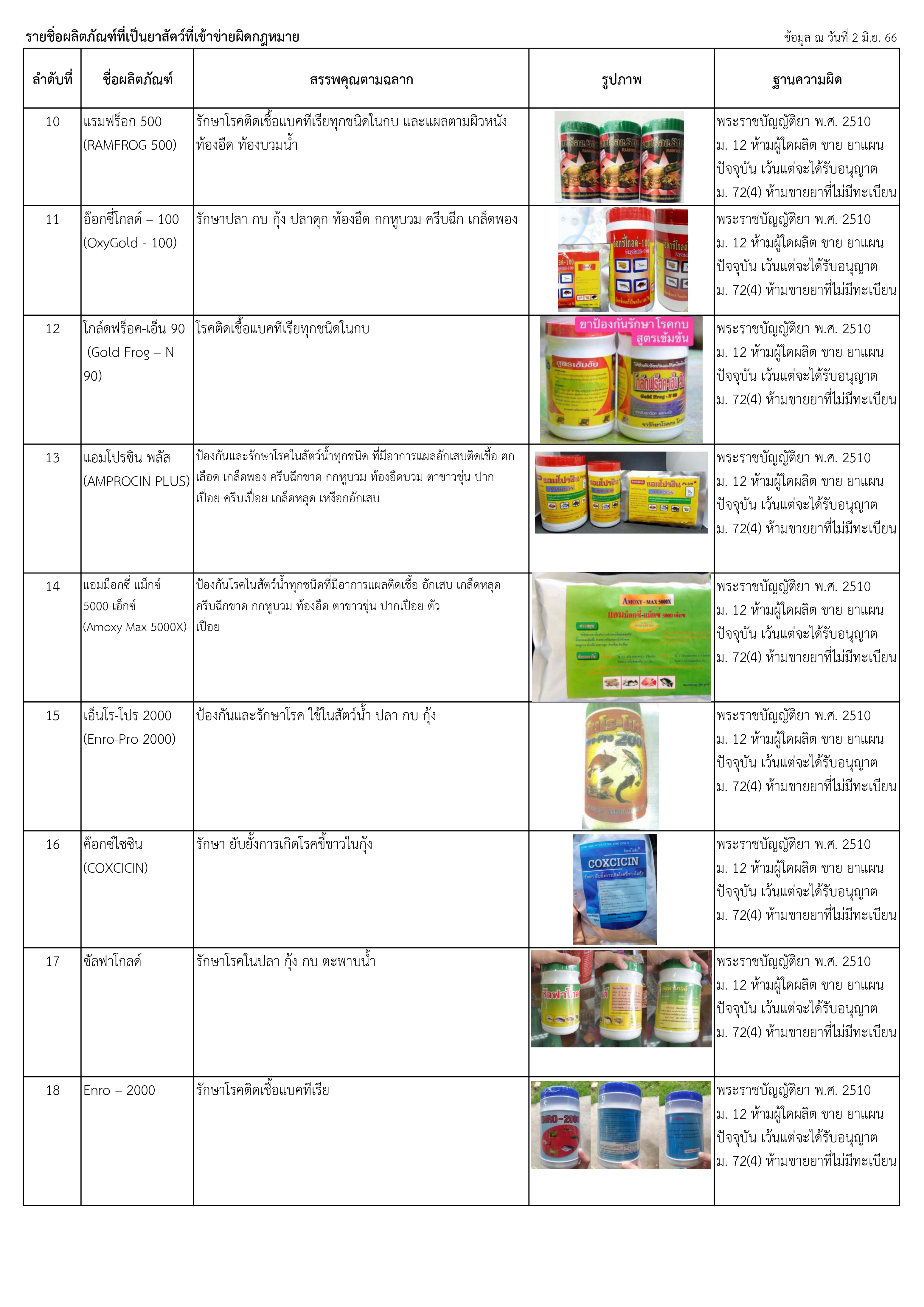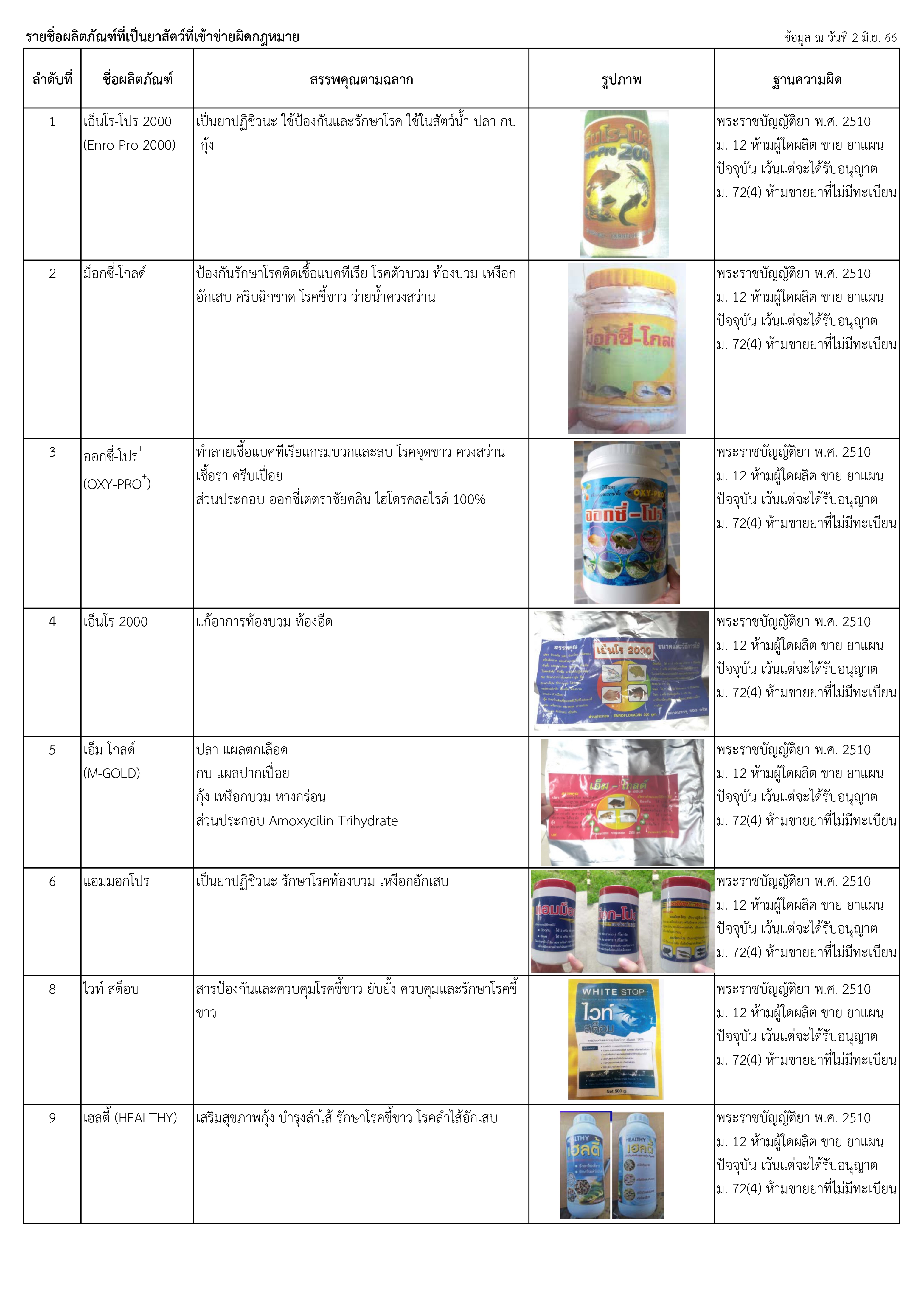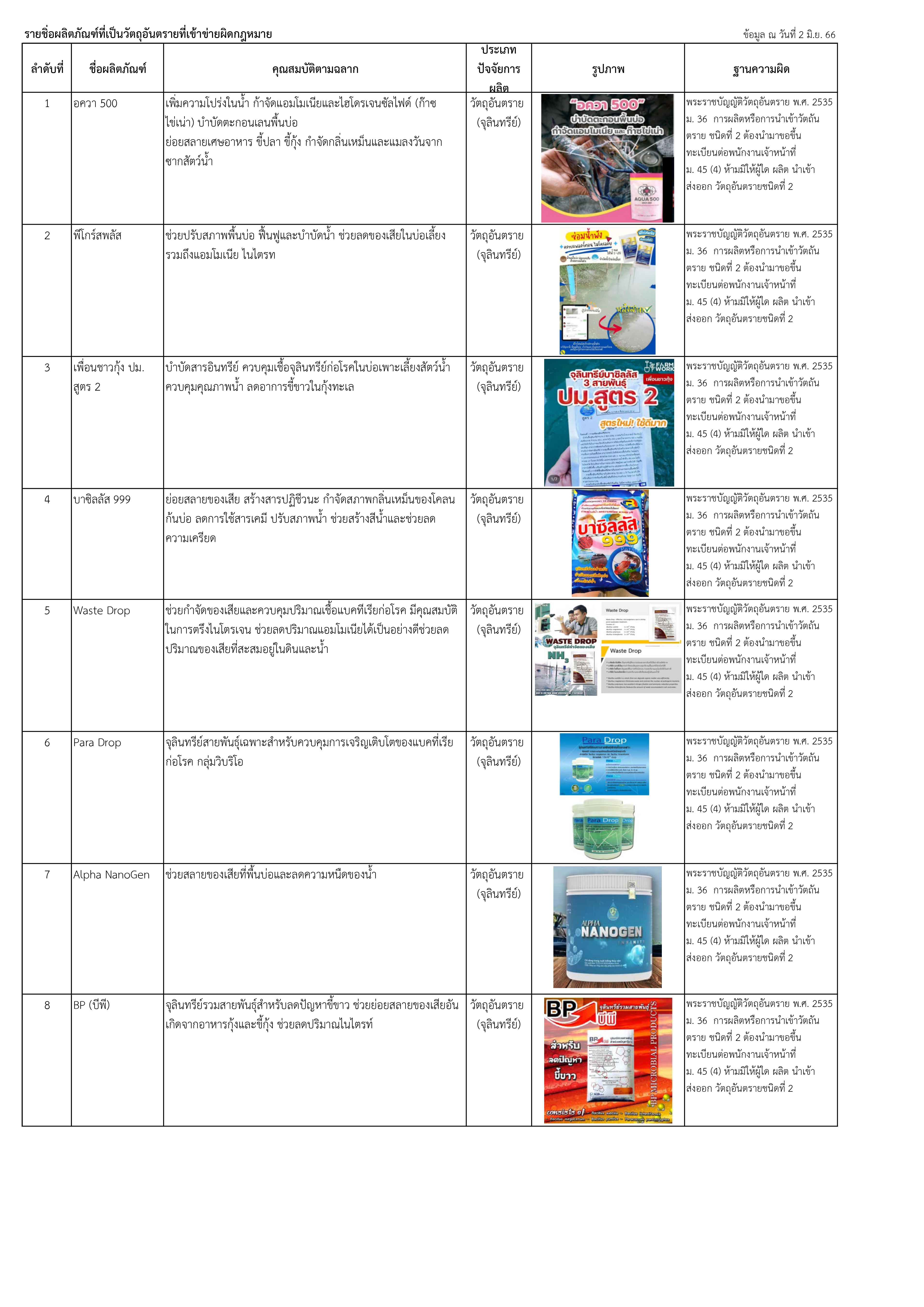 ประชาสัมพันธ์แจ้งเตือนผลิตภัณฑ์ที่เข้าข่ายผิดกฎหมาย ควรหลีกเลี่ยงการใช้ผลิตภัณฑ์ดังกล่าว เพราะหากซื้อปัจจัยการผบิตเหล่านี้มาใช้ในฟาร์ม จะมีความเสี่ยงในการตรวจพบสารตกค้าง สารปนเปื่อนในแหล่งน้ำหรือเป็นผลิตภัณฑ์ที่ไม่มีคุณภาพได้