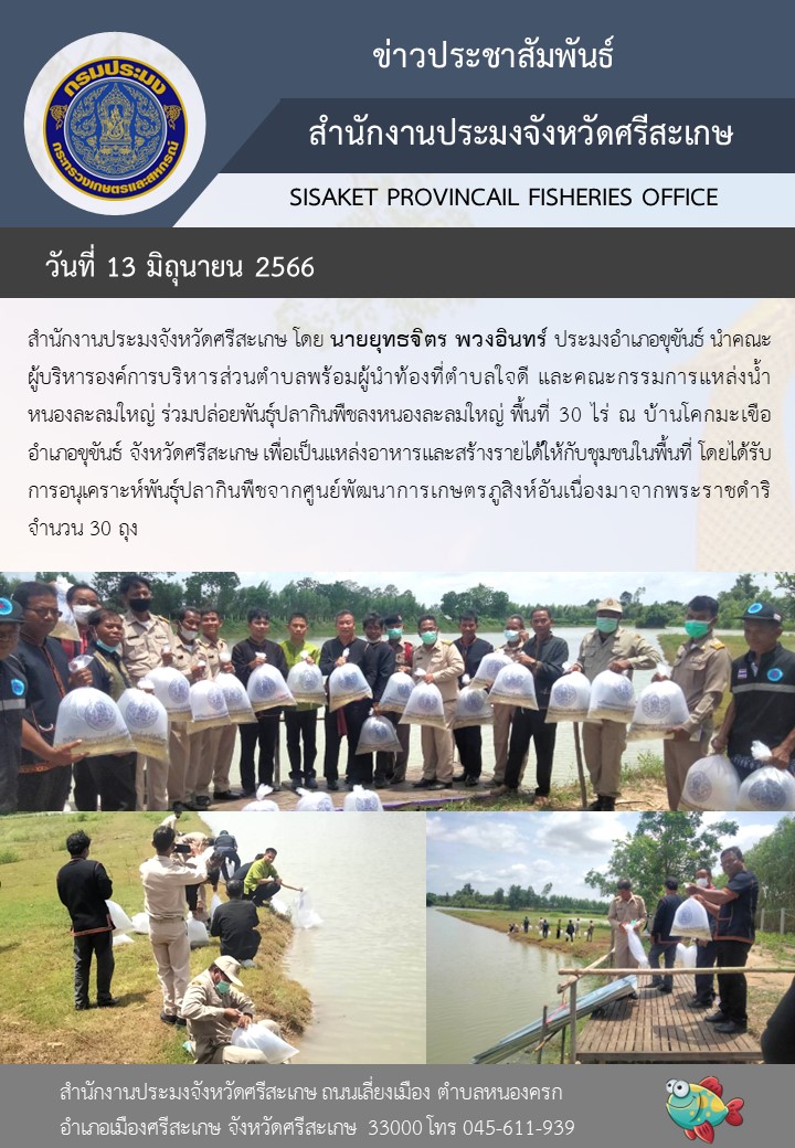 สำนักงานประมงจังหวัดศรีสะเกษ โดย นายยุทธจิตร พวงอินทร์ ประมงอำเภอขุขันธ์ นำคณะผู้บริหารองค์การบริหารส่วนตำบลพร้อมผู้นำท้องที่ตำบลใจดี และคณะกรรมการแหล่งน้ำหนองละลมใหญ่ ร่วมปล่อยพันธุ์ปลากินพืชลงหนองละลมใหญ่ พื้นที่ 30 ไร่ ณ บ้านโคกมะเขือ อำเภอขุขันธ์ จังหวัดศรีสะเกษ เพื่อเป็นแหล่งอาหารและสร้างรายได้ให้กับชุมชนในพื้นที่ โดยได้รับการอนุเคราะห์พันธุ์ปลากินพืชจากศูนย์พัฒนาการเกษตรภูสิงห์อันเนื่องมาจากพระราชดำริ จำนวน 30 ถุง