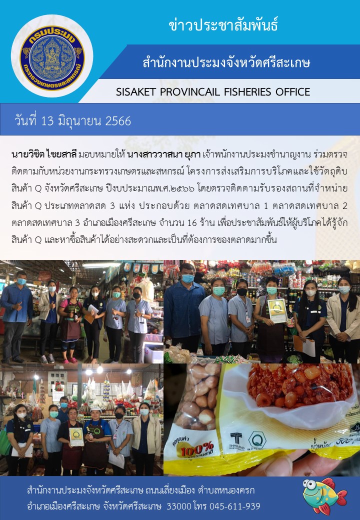 นายวิชิต ไชยสาลี มอบหมายให้ นางสาววาสนา ยุภา เจ้าพนักงานประมงชำนาญงาน ร่วมตรวจติดตามกับหน่วยงานกระทรวงเกษตรและสหกรณ์ โครงการส่งเสริมการบริโภคและใช้วัตถุดิบ สินค้า Q จังหวัดศรีสะเกษ ปีงบประมาณพ.ศ.๒๕๖๖ โดยตรวจติดตามรับรองสถานที่จำหน่ายสินค้า Q ประเภทตลาดสด 3 แห่ง ประกอบด้วย ตลาดสดเทศบาล 1 ตลาดสดเทศบาล 2 ตลาดสดเทศบาล 3 อำเภอเมืองศรีสะเกษ จำนวน 16 ร้าน เพื่อประชาสัมพันธ์ให้ผู้บริโภคได้รู้จักสินค้า Q และหาซื้อสินค้าได้อย่างสะดวกและเป็นที่ต้องการของตลาดมากขึ้น