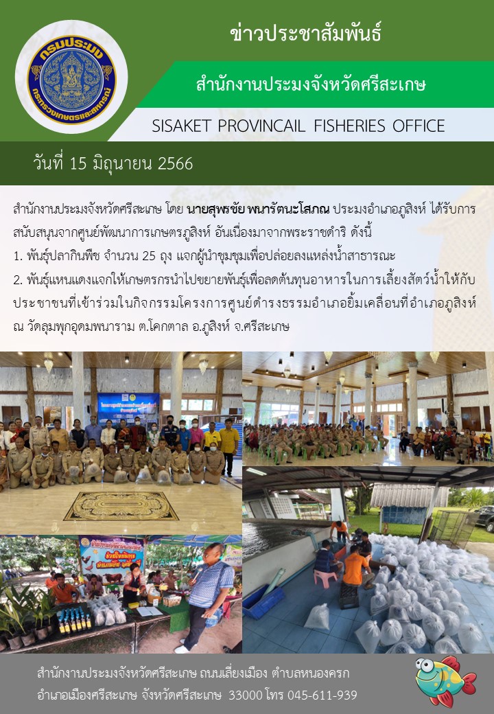 สำนักงานประมงจังหวัดศรีสะเกษ โดย นายสุพรชัย พนารัตนะโสภณ ประมงอำเภอภูสิงห์ ได้รับการสนับสนุนจากศูนย์พัฒนาการเกษตรภูสิงห์ อันเนื่องมาจากพระราชดำริ ดังนี้