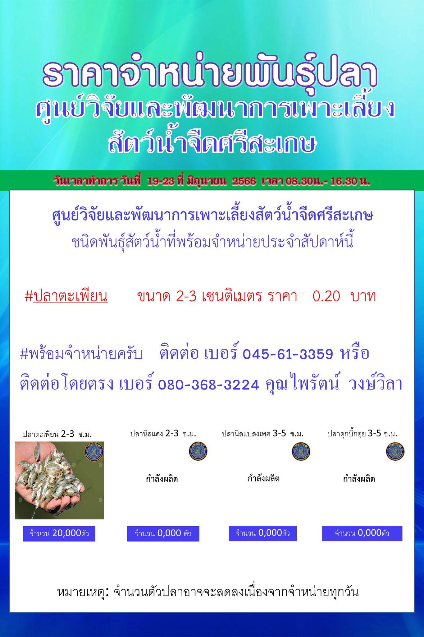 ศูนย์วิจัยและพัฒนาการเพาะเลี้ยงสัตว์น้ำจืดศรีสะเกษมีชนิดพันธุ์สัตว์น้ำพร้อมจำหน่าย วันที่ 19-23 มิถุนายน 2566