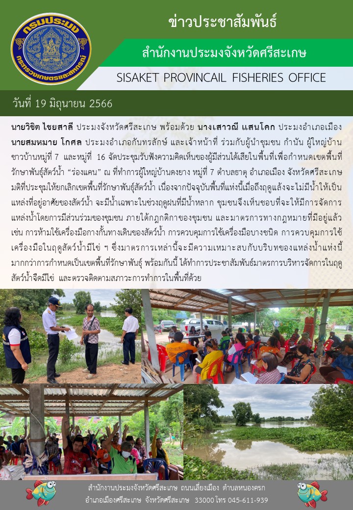 นายวิชิต ไชยสาลี ประมงจังหวัดศรีสะเกษ พร้อมด้วย นางเสาวณี แสนโคก ประมงอำเภอเมือง นายสมหมาย โกศล ประมงอำเภอกันทรลักษ์ และเจ้าหน้าที่ ร่วมกับผู้นำชุมชน กำนัน ผู้ใหญ่บ้าน ชาวบ้านหมู่ที่ 7 และหมู่ที่ 16 จัดประชุมรับฟังความคิดเห็นของผู้มีส่วนได้เสียในพื้นที่เพื่อกำหนดเขตพื้นที่รักษาพันธุ์สัตว์น้ำ “ร่องแคน” ณ ที่ทำการผู้ใหญ่บ้านดงยาง หมู่ที่ 7 ตำบลธาตุ อำเภอวังหิน จังหวัดศรีสะเกษ มติที่ประชุมให้ยกเลิกเขตพื้นที่รักษาพันธุ์สัตว์น้ำ เนื่องจากปัจจุบันพื้นที่แห่งนี้เมื่อถึงฤดูแล้งจะไม่มีน้ำ ให้เป็นแหล่งที่อยู่อาศัยของสัตว์น้ำ จะมีน้ำเฉพาะในช่วงฤดูฝนที่มีน้ำหลาก ชุมชนจึงเห็นชอบที่จะให้มีการจัดการแหล่งน้ำโดยการมีส่วนร่วมของชุมชน ภายใต้กฎกติกาของชุมชน และมาตรการทางกฎหมายที่มีอยู่แล้ว เช่น การห้ามใช้เครื่องมือกางกั้นทางเดินของสัตว์น้ำ การควบคุมการใช้เครื่องมือบางชนิด การควบคุมการใช้เครื่องมือในฤดูสัตว์น้ำมีไข่ ฯ ซึ่งมาตราการเหล่านี้จะมีความเหมาะสบกับบริบทของแหล่งน้ำแห่งนี้ มากกว่าการกำหนดเป็นเขตพื้นที่รักษาพันธุ์ พร้อมกันนี้ ได้ทำการประชาสัมพันธ์มาตรการบริหารจัดการในฤดูสัตว์น้ำจืดมีไข่และตรวจติดตามสภาวะการทำการในพื้นที่ด้วย
