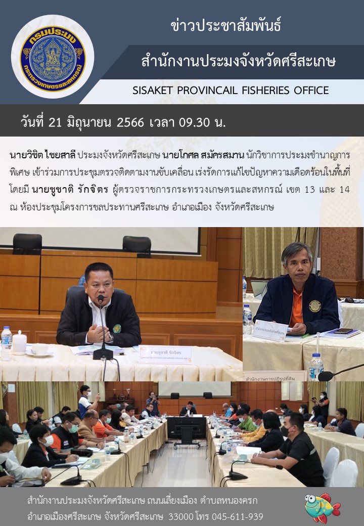 นายวิชิต ไชยสาลี ประมงจังหวัดศรีสะเกษ นายโกศล สมัครสมาน นักวิชาการประมงชำนาญการพิเศษ เข้าร่วมการประชุมตรวจติดตามงานขับเคลื่อน เร่งรัดการแก้ไขปัญหาความเดือดร้อนในพื้นที่ โดยมี นายชูชาติ รักจิตร ผู้ตรวจราชการกระทรวงเกษตรและสหกรณ์ เขต 13 และ 14 เป็นประธาน ณ ห้องประชุมโครงการชลประทานศรีสะเกษ อำเภอเมือง จังหวัดศรีสะเกษ