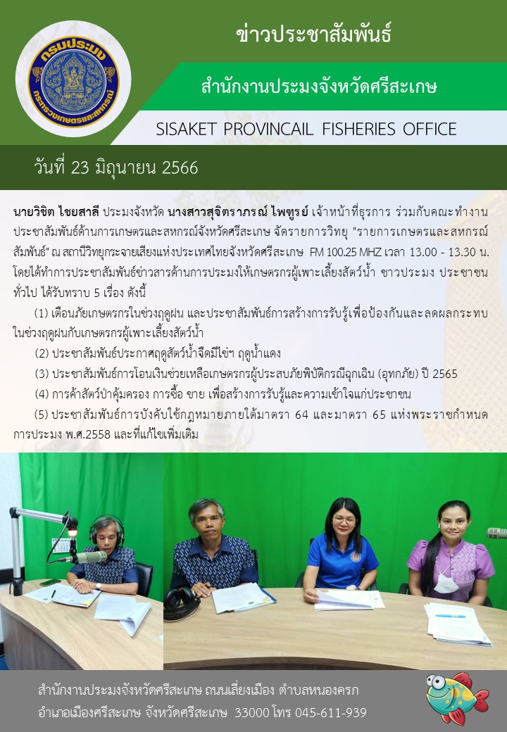 นายวิชิต ไชยสาลี ประมงจังหวัด นางสาวสุจิตราภรณ์ ไพฑูรย์ เจ้าหน้าที่ธุรการ ร่วมกับคณะทำงานประชาสัมพันธ์ด้านการเกษตรและสหกรณ์จังหวัดศรีสะเกษ จัดรายการวิทยุ "รายการเกษตรและสหกรณ์สัมพันธ์" ณ สถานีวิทยุกระจายเสียงแห่งประเทศไทยจังหวัดศรีสะเกษ FM 100.25 MHZ เวลา 13.00 - 13.30 น.โดยได้ทำการประชาสัมพันธ์ข่าวสารด้านการประมงให้เกษตรกรผู้เพาะเลี้ยงสัตว์น้ำ ชาวประมง ประชาชนทั่วไป ได้รับทราบ 5 เรื่อง ดังนี้