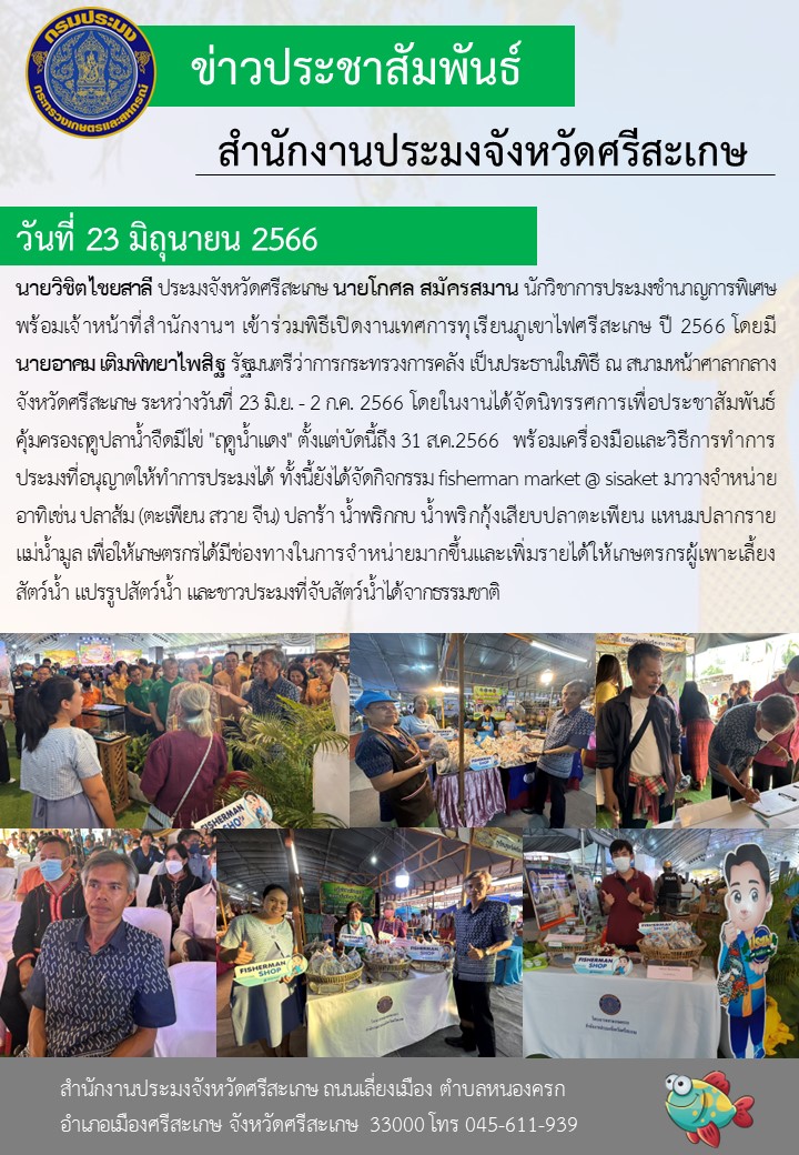 นายวิชิต ไชยสาลี ประมงจังหวัดศรีสะเกษ นายโกศล สมัครสมาน นักวิชาการประมงชำนาญการพิเศษ พร้อมเจ้าหน้าที่สำนักงานฯ เข้าร่วมพิธีเปิดงานเทศการทุเรียนภูเขาไฟศรีสะเกษ ปี 2566 โดยมี นายอาคม เติมพิทยาไพสิฐ รัฐมนตรีว่าการกระทรวงการคลัง เป็นประธานในพิธี ณ สนามหน้าศาลากลางจังหวัดศรีสะเกษ ระหว่างวันที่ 23 มิ.ย. - 2 ก.ค. 2566 โดยในงานได้จัดนิทรรศการเพื่อประชาสัมพันธ์คุ้มครองฤดูปลาน้ำจืดมีไข่ "ฤดูน้ำแดง" ตั้งแต่บัดนี้ถึง 31 ส.ค.2566 พร้อมเครื่องมือและวิธีการทำการประมงที่อนุญาตให้ทำการประมงได้ ทั้งนี้ยังได้จัดกิจกรรม fisherman market @ sisaket มาวางจำหน่าย อาทิเช่น ปลาส้ม (ตะเพียน สวาย จีน) ปลาร้า น้ำพริกกบ น้ำพริกกุ้งเสียงปลาตะเพียน แหนมปลากรายแม่น้ำมูล เพื่อให้เกษตรกรได้มีช่องทางในการจำหน่ายมากขึ้นและเพิ่มรายได้ให้เกษตรกรผู้เพาะเลี้ยงสัตว์น้ำ แปรรูปสัตว์น้ำ และชาวประมงที่จับสัตว์น้ำได้จากธรรมชาติ