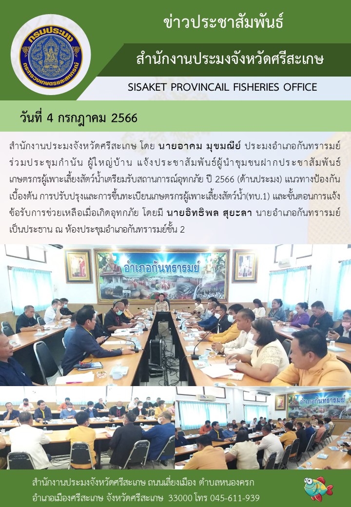สำนักงานประมงจังหวัดศรีสะเกษ โดย นายอาคม มุขมณีย์ ประมงอำเภอกันทรารมย์ ร่วมประชุมกำนัน ผู้ใหญ่บ้าน แจ้งประชาสัมพันธ์ผู้นำชุมชนฝากประชาสัมพันธ์ เกษตรกรผู้เพาะเลี้ยงสัตว์น้ำเตรียมรับสถานการณ์อุทกภัย ปี 2566 (ด้านประมง) แนวทางป้องกันเบื้องต้น การปรับปรุงและการขึ้นทะเบียนเกษตรกรผู้เพาะเลี้ยงสัตว์น้ำ(ทบ.1) และขั้นตอนการแจ้งข้อรับการช่วยเหลือเมื่อเกิดอุทกภัย โดยมี นายอิทธิพล สุยะลา นายอำเภอกันทรารมย์ เป็นประธาน ณ ห้องประชุมอำเภอกันทรารมย์ชั้น 2