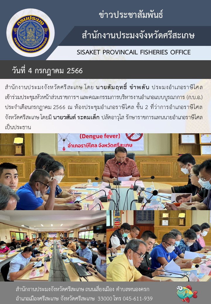 สำนักงานประมงจังหวัดศรีสะเกษ โดย นายสัมฤทธิ์ ขำพลับ ประมงอำเภอราษีไศล เข้าร่วมประชุมหัวหน้าส่วนราชการฯ และคณะกรรมการบริหารงานอำเภอแบบบูรณาการ (ก.บ.อ.) ประจำเดือนกรกฎาคม 2566 ณ ห้องประชุมอำเภอราษีไศล ชั้น 2 ที่ว่าการอำเภอราษีไศล จังหวัดศรีสะเกษ โดยมี นายวสันต์ ระดมเล็ก ปลัดอาวุโส รักษาราชการแทนนายอำเภอราษีไศล เป็นประธาน