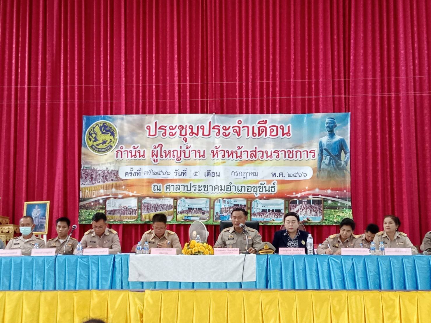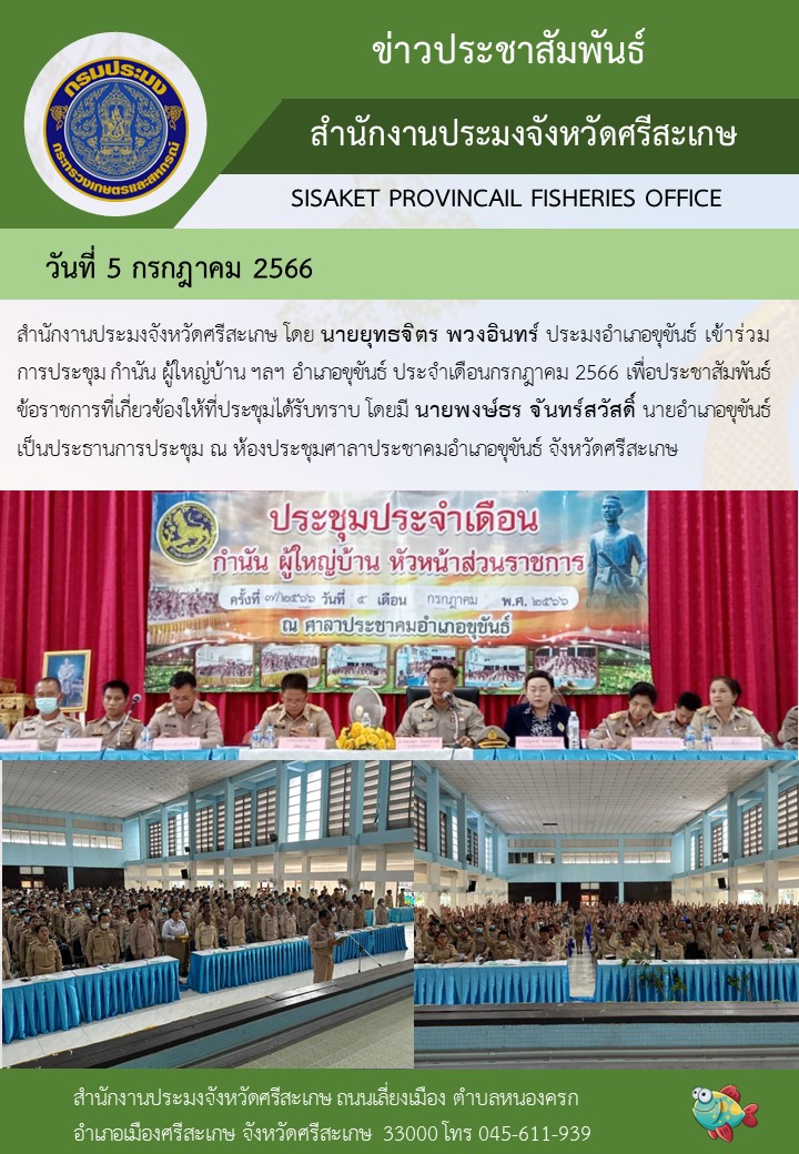 สำนักงานประมงจังหวัดศรีสะเกษ โดย นายยุทธจิตร พวงอินทร์ ประมงอำเภอขุขันธ์ เข้าร่วม การประชุม กำนัน ผู้ใหญ่บ้าน ฯลฯ อำเภอขุขันธ์ ประจำเดือนกรกฎาคม 2566 เพื่อประชาสัมพันธ์ข้อราชการที่เกี่ยวข้องให้ที่ประชุมได้รับทราบ โดยมี นายพงษ์ธร จันทร์สวัสดิ์ นายอำเภอขุขันธ์ เป็นประธานการประชุม ณ ห้องประชุมศาลาประชาคมอำเภอขุขันธ์ จังหวัดศรีสะเกษ