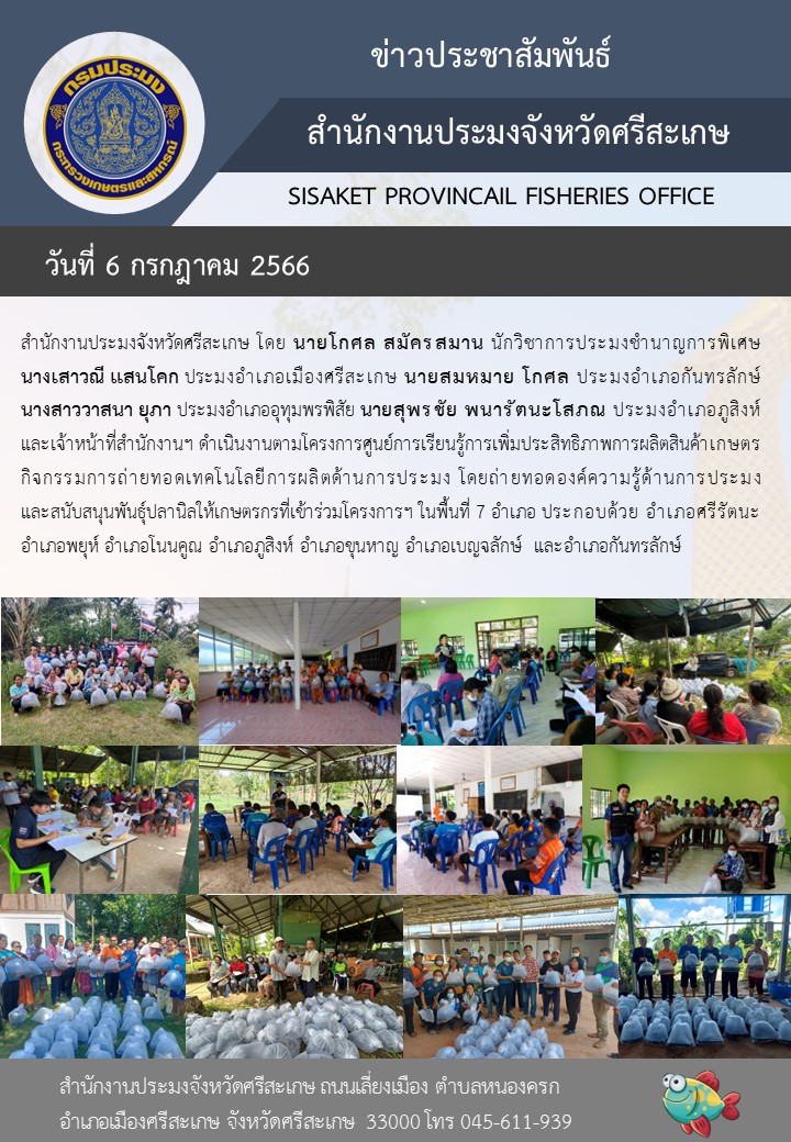 สำนักงานประมงจังหวัดศรีสะเกษ โดย นายโกศล สมัครสมาน นักวิชาการประมงชำนาญการพิเศษ นางเสาวณี แสนโคก ประมงอำเภอเมืองศรีสะเกษ นายสมหมาย โกศล ประมงอำเภอกันทรลักษ์ นางสาววาสนา ยุภา ประมงอำเภออุทุมพรพิสัย นายสุพรชัย พนารัตนะโสภณ ประมงอำเภอภูสิงห์ และเจ้าหน้าที่สำนักงานฯ ดำเนินงานตามโครงการศูนย์การเรียนรู้การเพิ่มประสิทธิภาพการผลิตสินค้าเกษตร กิจกรรมการถ่ายทอดเทคโนโลยีการผลิตด้านการประมง โดยถ่ายทอดองค์ความรู้ด้านการประมงและสนับสนุนพันธุ์ปลานิล ให้เกษตรกรที่เข้าร่วมโครงการฯ ในพื้นที่ 7 อำเภอ ประกอบด้วย อำเภอศรีรัตนะอำเภอพยุห์ อำเภอโนนคูณ อำเภอภูสิงห์ อำเภอขุนหาญ อำเภอเบญจลักษ์ และอำเภอกันทรลักษ์