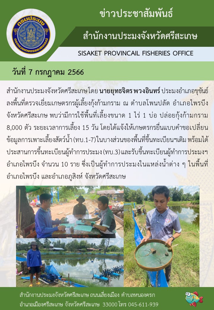 สำนักงานประมงจังหวัดศรีสะเกษ โดย นายยุทธจิตร พวงอินทร์ ประมงอำเภอขุขันธ์ ลงพื้นที่ตรวจเยี่ยมเกษตรกรผู้เลี้ยงกุ้งก้ามกราม ณ ตำบลโพนปลัด อำเภอไพรบึง จังหวัดศรีสะเกษ พบว่ามีการใช้พื้นที่เลี้ยงขนาด 1 ไร่ 1 บ่อ ปล่อยกุ้งก้ามกราม 8,000 ตัว ระยะเวลาการเลี้ยง 15 วัน โดยได้แจ้งให้เกษตรกรยื่นแบบคำขอเปลี่ยนข้อมูลการเพาะเลี้ยงสัตว์น้ำ (ทบ.1-7) ในบางส่วนของพื้นที่ขึ้นทะเบียนฯเดิม พร้อมได้ประสานการขึ้นทะเบียนผู้ทำการประมง (ทบ.3) และรับขึ้นทะเบียนผู้ทำการประมงฯ อำเภอไพรบึง จำนวน 10 ราย ซึ่งเป็นผู้ทำการประมงในแหล่งน้ำต่าง ๆ ในพื้นที่อำเภอไพรบึง และอำเภอภูสิงห์ จังหวัดศรีสะเกษ