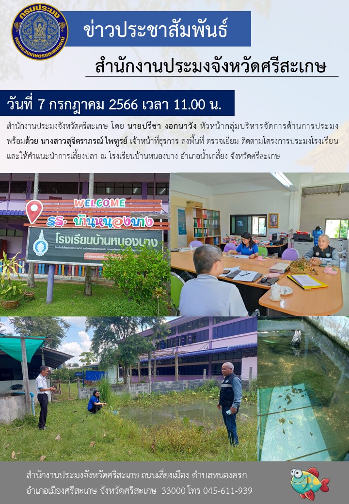 สำนักงานประมงจังหวัดศรีสะเกษ โดย นายปรีชา งอกนาวัง หัวหน้ากลุ่มบริหารจัดการด้านการประมง พร้อมด้วย นางสาวสุจิตราภรณ์ ไพฑูรย์ เจ้าหน้าที่ธุรการ ลงพื้นที่ ตรวจเยี่ยม ติดตามโครงการประมงโรงเรียน และให้คำแนะนำการเลี้ยงปลา ณ โรงเรียนบ้านหนองบาง อำเภอน้ำเกลี้ยง จังหวัดศรีสะเกษ