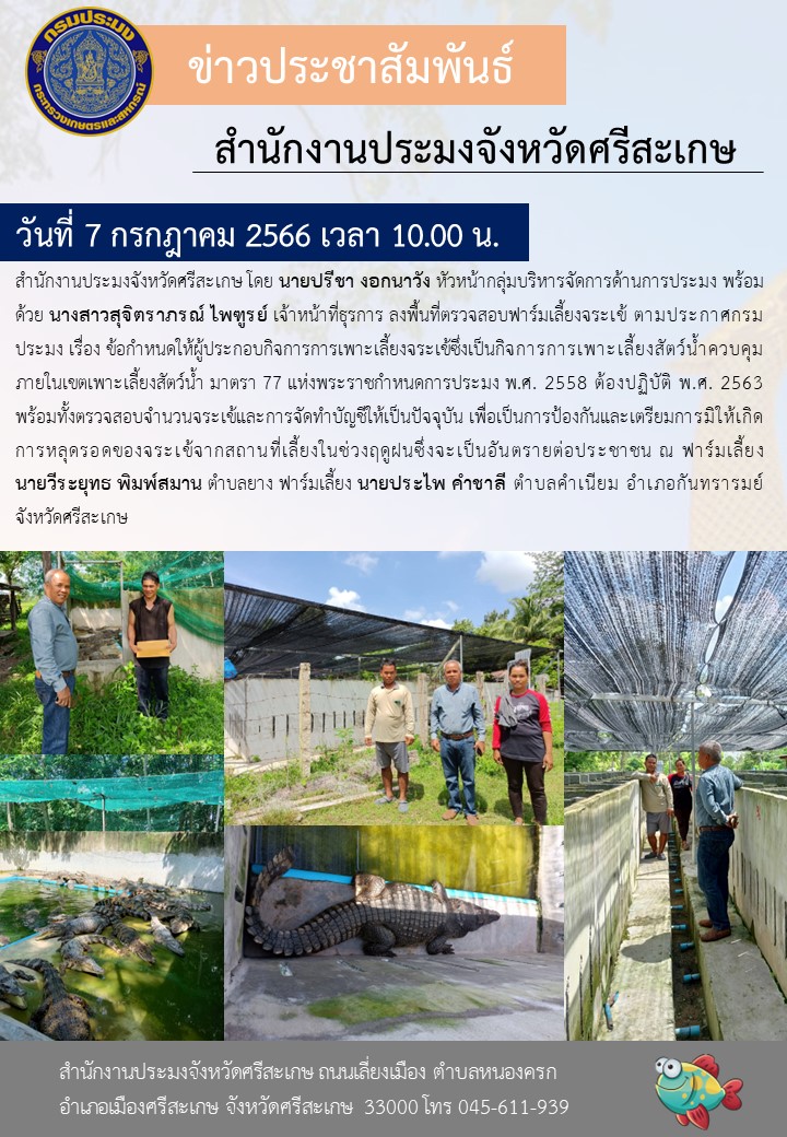 สำนักงานประมงจังหวัดศรีสะเกษ โดย นายปรีชา งอกนาวัง หัวหน้ากลุ่มบริหารจัดการด้านการประมง พร้อมด้วย นางสาวสุจิตราภรณ์ ไพฑูรย์ เจ้าหน้าที่ธุรการ ลงพื้นที่ตรวจสอบฟาร์มเลี้ยงจระเข้ ตามประกาศกรมประมง เรื่อง ข้อกำหนดให้ผู้ประกอบกิจการการเพาะเลี้ยงจระเข้ซึ่งเป็นกิจการการเพาะเลี้ยงสัตว์น้ำควบคุมภายในเขตเพาะเลี้ยงสัตว์น้ำ มาตรา 77 แห่งพระราชกำหนดการประมง พ.ศ. 2558 ต้องปฏิบัติ พ.ศ. 2563 พร้อมทั้งตรวจสอบจำนวนจระเข้และการจัดทำบัญชีให้เป็นปัจจุบัน เพื่อเป็นการป้องกันและเตรียมการมิให้เกิดการหลุดรอดของจระเข้จากสถานที่เลี้ยงในช่วงฤดูฝนซึ่งจะเป็นอันตรายต่อประชาชน ณ ฟาร์มเลี้ยง นายวีระยุทธ พิมพ์สมาน ตำบลยาง ฟาร์มเลี้ยง นายประไพ คำชาลี ตำบลคำเนียม อำเภอกันทรารมย์ จังหวัดศรีสะเกษ