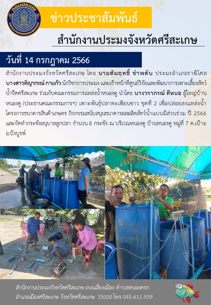 สำนักงานประมงจังหวัดศรีสะเกษ โดย นายสัมฤทธิ์ ขำพลับ ประมงอำเภอราษีไศล นางสาวติญากรณ์ กาแก้ว นักวิชาการประมง และเจ้าหน้าที่ศูนย์วิจัยและพัฒนาการเพาะเลี้ยงสัตว์น้ำจืดศรีสะเกษ ร่วมกับคณะกรรมการแหล่งน้ำหนองคู นำโดย นางวราภรณ์ ดีหนอ ผู้ใหญ่บ้านหนองคู (ประธานคณะกรรมการฯ) เพาะพันธุ์ปลาตะเพียนขาว ชุดที่ 2 เพื่อปล่อยลงแหล่งน้ำโครงการธนาคารสินค้าเกษตร กิจกรรมสนับสนุนธนาคารผลผลิตสัตว์น้ำแบบมีส่วนร่วม ปี 2566   และจัดทำกระชังอนุบาลลูกปลา จำนวน 8 กระชัง ณ บริเวณหนองคู บ้านหนองคู หมู่ที่ 7 ต.เป๊าะ อ.บึงบูรพ์