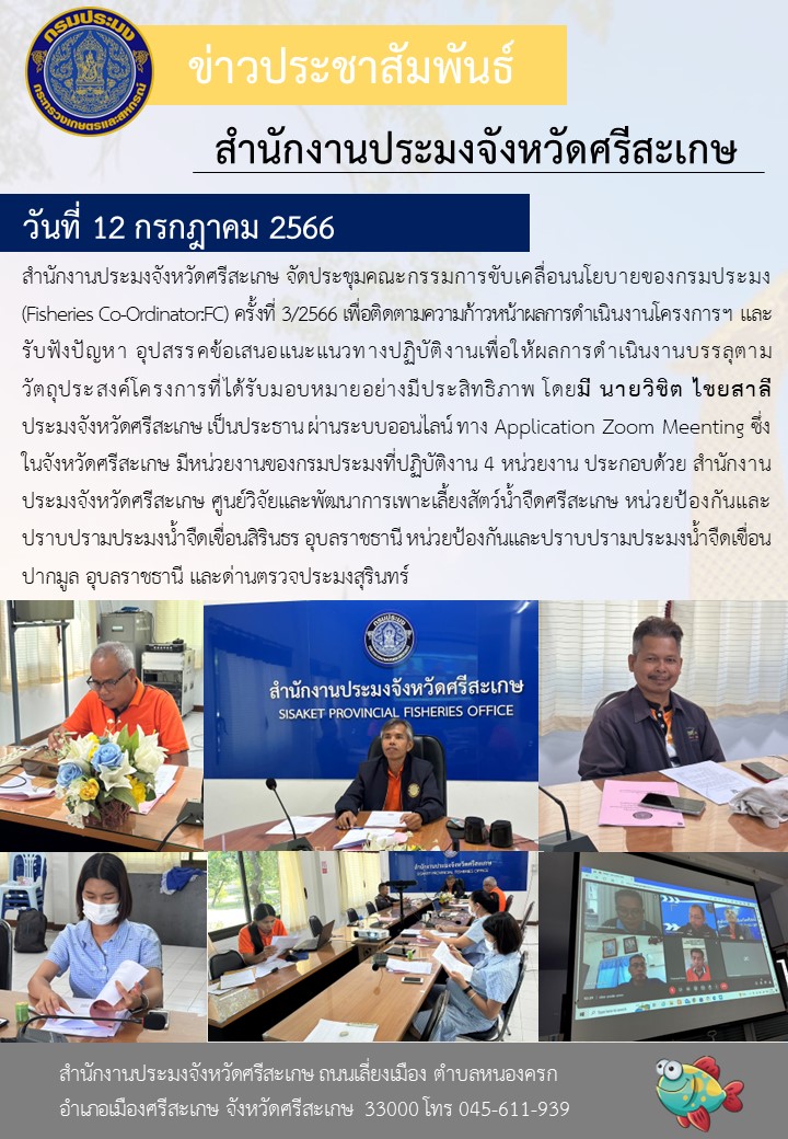 สำนักงานประมงจังหวัดศรีสะเกษ จัดประชุมคณะกรรมการขับเคลื่อนนโยบายของกรมประมง (Fisheries Co-Ordinator : FC) ครั้งที่ 3/2566 เพื่อติดตามความก้าวหน้าผลการดำเนินงานโครงการฯ และรับฟังปัญหา อุปสรรคข้อเสนอแนะแนวทางปฏิบัติงานเพื่อให้ผลการดำเนินงานบรรลุตามวัตถุประสงค์โครงการที่ได้รับมอบหมายอย่างมีประสิทธิภาพ โดยมี นายวิชิต ไชยสาลี ประมงจังหวัดศรีสะเกษ เป็นประธาน ผ่านระบบออนไลน์ ทาง Application Zoom Meenting ซึ่งในจังหวัดศรีสะเกษ มีหน่วยงานของกรมประมงที่ปฏิบัติงาน 4 หน่วยงาน ประกอบด้วย สำนักงานประมงจังหวัดศรีสะเกษ ศูนย์วิจัยและพัฒนาการเพาะเลี้ยงสัตว์น้ำจืดศรีสะเกษ หน่วยป้องกันและปราบปรามประมงน้ำจืดเขื่อนสิรินธร อุบลราชธานี หน่วยป้องกันและปราบปรามประมงน้ำจืดเขื่อนปากมูล อุบลราชธานี และด่านตรวจประมงสุรินทร์