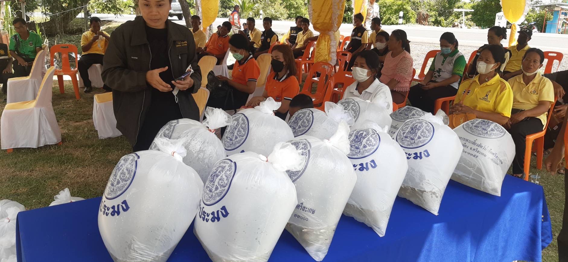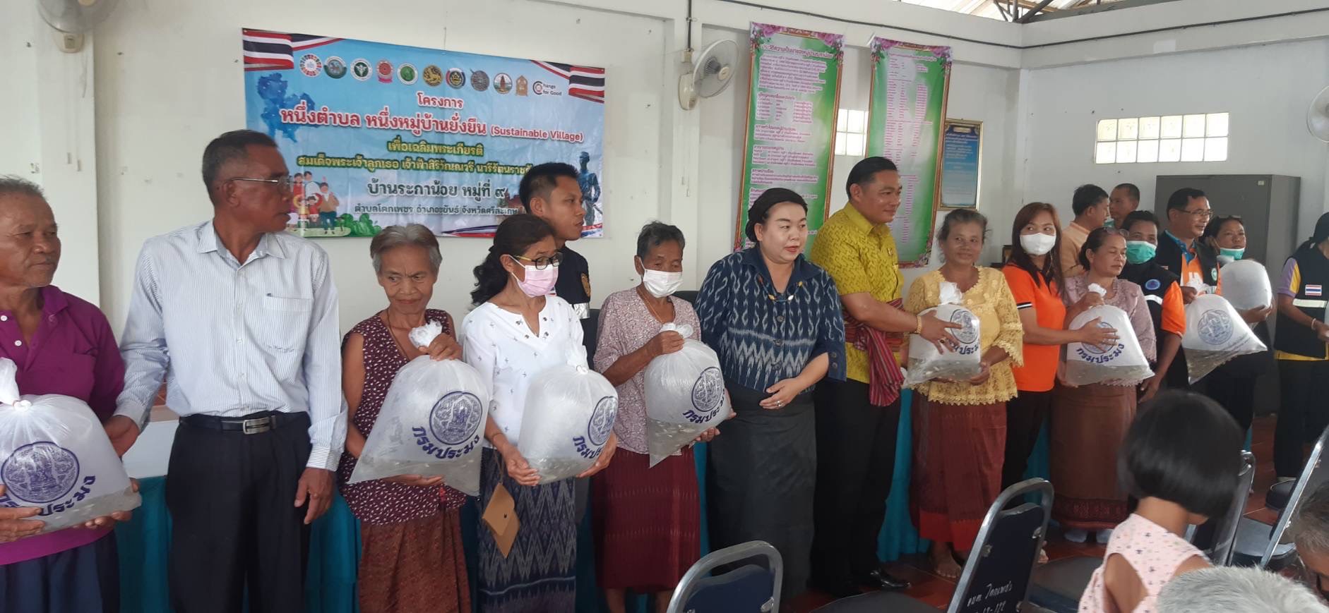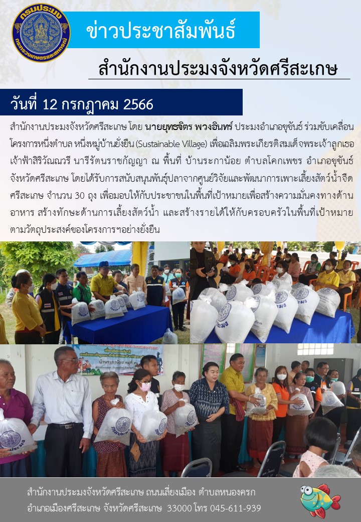 สำนักงานประมงจังหวัดศรีสะเกษ โดย นายยุทธจิตร พวงอินทร์ ประมงอำเภอขุขันธ์ ร่วมขับเคลื่อนโครงการหนึ่งตำบล หนึ่งหมู่บ้านยั่งยืน (Sustainable Village) เพื่อเฉลิมพระเกียรติสมเด็จพระเจ้าลูกเธอ เจ้าฟ้าสิริวัณณวรี นารีรัตนราชกัญญา ณ พื้นที่ บ้านระกาน้อย ตำบลโคกเพชร อำเภอขุขันธ์ จังหวัดศรีสะเกษ โดยได้รับการสนับสนุนพันธุ์ปลาจากศูนย์วิจัยและพัฒนาการเพาะเลี้ยงสัตว์น้ำจืดศรีสะเกษ จำนวน 30 ถุง เพื่อมอบให้กับประชาชนในพื้นที่เป้าหมายเพื่อสร้างความมั่นคงทางด้านอาหาร สร้างทักษะด้านการเลี้ยงสัตว์น้ำ และสร้างรายได้ให้กับครอบครัวในพื้นที่เป้าหมายตามวัตถุประสงค์ของโครงการฯอย่างยั่งยืน