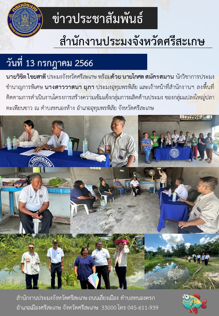 นายวิชิต ไชยสาลี ประมงจังหวัดศรีสะเกษ พร้อมด้วย นายโกศล สมัครสมาน นักวิชาการประมงชำนาญการพิเศษ นางสาววาสนา ยุภา ประมงอุทุมพรพิสัย และเจ้าหน้าที่สำนักงานฯ ลงพื้นที่ติดตามการดำเนินงานโครงการสร้างความเข้มแข็งกลุ่มการผลิตด้านประมง ของกลุ่มแปลงใหญ่ปลาตะเพียนขาว ณ ตำบลหนองห้าง อำเภออุทุมพรพิสัย จังหวัดศรีสะเกษ