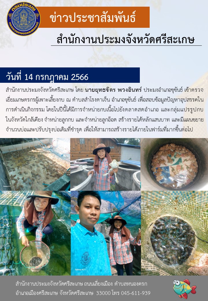 สำนักงานประมงจังหวัดศรีสะเกษ โดย นายยุทธจิตร พวงอินทร์ ประมงอำเภอขุขันธ์ เข้าตรวจเยี่ยมเกษตรกรผู้เพาะเลี้ยงกบ ณ ตำบลสำโรงตาเจ็น อำเภอขุขันธ์ เพื่อสอบข้อมูลปัญหาอุปสรรคในการดำเนินกิจกรรม โดยในปีนี้ได้มีการจำหน่ายกบเนื้อไปยังตลาดสดอำเภอ และกลุ่มแปรรูปกบในจังหวัดใกล้เคียง จำหน่ายลูกกบ และจำหน่ายลูกอ๊อด สร้างรายได้หลักแสนบาท และมีแผนขยายจำนวนบ่อและปรับปรุงบ่อเดิมที่ชำรุด เพื่อให้สามารถสร้างรายได้ภายในฟาร์มที่มากขึ้นต่อไป