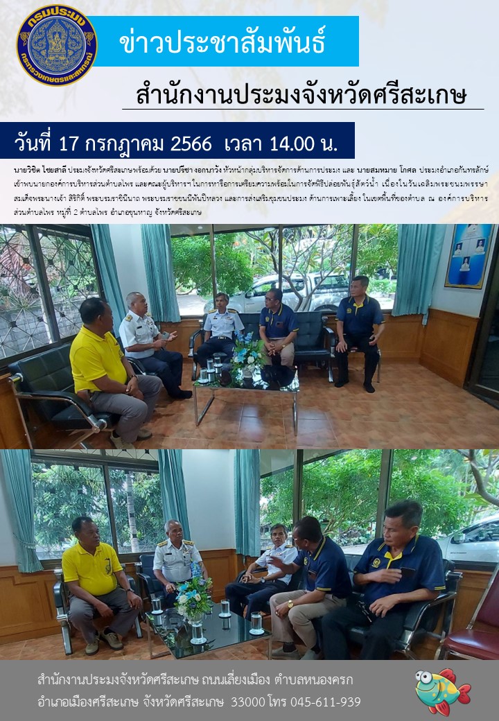 นายวิชิต ไชยสาลี ประมงจังหวัดศรีสะเกษ พร้อมด้วยนายปรีชา งอกนาวัง หัวหน้ากลุ่มบริหารจัดการด้านการประมง และนายสมหมาย โกศล ประมงอำเภอกันทรลักษ์ เข้าพบนายกองค์การบริหารส่วนตำบลไพร และคณะผู้บริหารฯ ในการหารือการเตรียมความพร้อมในการจัดพิธีปล่อยพันธุ์สัตว์น้ำ เนื่องในวันเฉลิมพระชนมพรรษาสมเด็จพระนางเจ้า สิริกิติ์ พระบรมราชินีนาถ พระบรมราชชนนีพันปีหลวง และการส่งเสริมชุมชนประมง ด้านการเพาะเลี้ยง ในเขตพื้นที่ของตำบล ณ องค์การบริหารส่วนตำบลไพร หมู่ที่ 2 ตำบลไพร อำเภอขุนหาญ จังหวัดศรีสะเกษ
