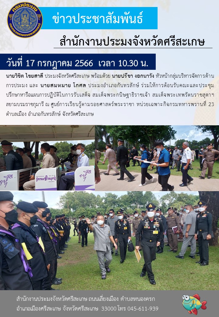 นายวิชิต ไชยสาลี ประมงจังหวัดศรีสะเกษ พร้อมด้วยนายปรีชา งอกนาวัง หัวหน้ากลุ่มบริหารจัดการด้านการประมง และนายสมหมาย โกศล ประมงอำเภอกันทรลักษ์ ร่วมให้การต้อนรับคณะ และประชุมปรึกษาหารือแผนการปฏิบัติในการรับเสด็จ สมเด็จพระกนิษฐาธิราชเจ้า สมเด็จพระเทพรัตนราชสุดาฯ สยามบรมราชกุมารี ณ ศูนย์การเรียนรู้ตามรอยศาสตร์พระราชา หน่วยเฉพาะกิจกรมทหารพรานที่ 23 ตำบลเมือง อำเภอกันทรลักษ์ จังหวัดศรีสะเกษ