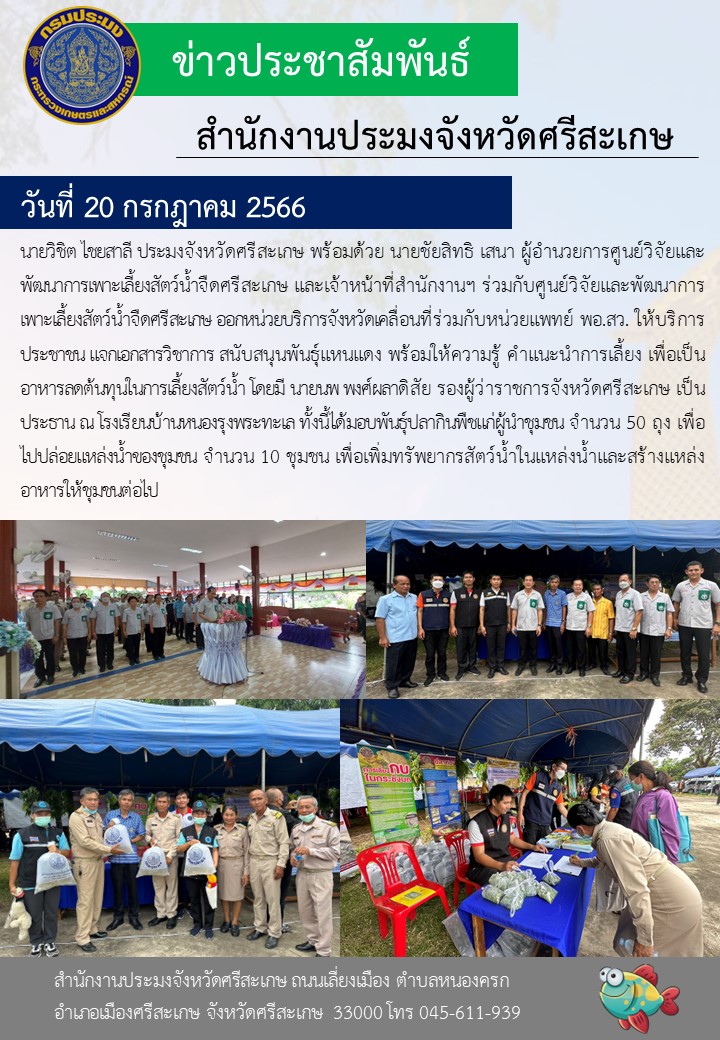 นายวิชิต ไชยสาลี ประมงจังหวัดศรีสะเกษ พร้อมด้วย นายชัยสิทธิ เสนา ผู้อำนวยการศูนย์วิจัยและพัฒนาการเพาะเลี้ยงสัตว์น้ำจืดศรีสะเกษ และเจ้าหน้าที่สำนักงานฯ ร่วมกับศูนย์วิจัยและพัฒนาการเพาะเลี้ยงสัตว์น้ำจืดศรีสะเกษ ออกหน่วยบริการจังหวัดเคลื่อนที่ร่วมกับหน่วยแพทย์ พอ.สว. ให้บริการประชาชน แจกเอกสารวิชาการ สนับสนุนพันธุ์แหนแดง พร้อมให้ความรู้ คำแนะนำการเลี้ยง เพื่อเป็นอาหารลดต้นทุนในการเลี้ยงสัตว์น้ำ โดยมี นายนพ พงศ์ผลาดิสัย รองผู้ว่าราชการจังหวัดศรีสะเกษ เป็นประธาน ณ โรงเรียนบ้านหนองรุงพระทะเล ทั้งนี้ได้มอบพันธุ์ปลากินพืชแก่ผู้นำชุมชน จำนวน 50 ถุง เพื่อไปปล่อยแหล่งน้ำของชุมชน จำนวน 10 ชุมชน เพื่อเพิ่มทรัพยากรสัตว์น้ำในแหล่งน้ำและสร้างแหล่งอาหารให้ชุมชนต่อไป