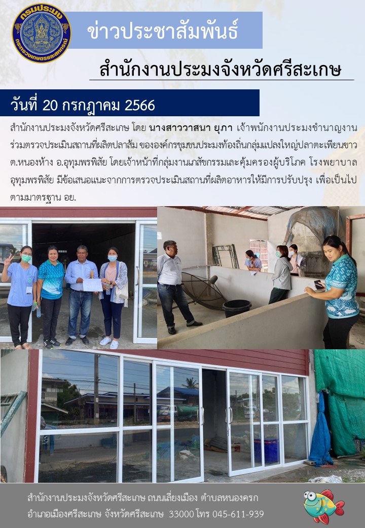 สำนักงานประมงจังหวัดศรีสะเกษ โดย นางสาววาสนา ยุภา เจ้าพนักงานประมงชำนาญงาน ร่วมตรวจประเมินสถานที่ผลิตปลาส้ม ขององค์กรชุมชนประมงท้องถิ่นกลุ่มแปลงใหญ่ปลาตะพียนขาว ต.หนองห้าง อ.อุทุมพรพิสัย โดยเจ้าหน้าที่กลุ่มงานเภสัชกรรมเเละคุ้มครองผู้บริโภค โรงพยาบาลอุทุมพรพิสัย มีข้อสนอแนะจากการตรวจประเมินสถานที่ผลิตอาหารให้มีการปรับปรุง เพื่อเป็นไปตามมาตรฐาน อย.