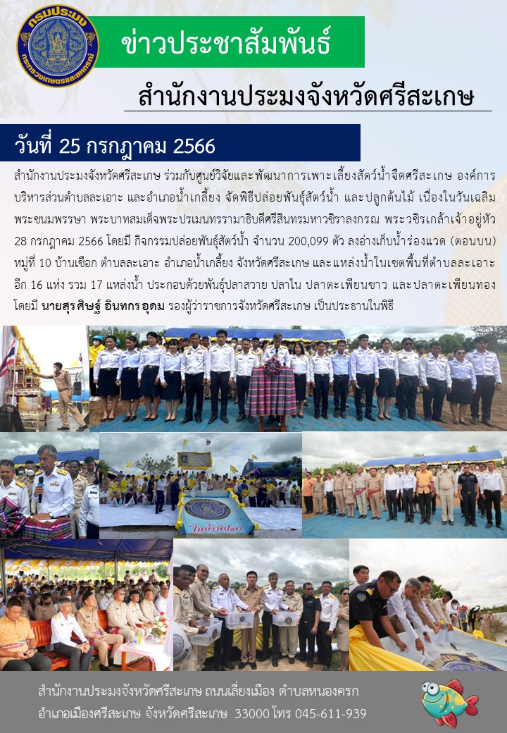 สำนักงานประมงจังหวัดศรีสะเกษ ร่วมกับศูนย์วิจัยและพัฒนาการเพาะเลี้ยงสัตว์น้ำจืดศรีสะเกษ องค์การบริหารส่วนตำบลละเอาะ และอำเภอน้ำเกลี้ยง จัดพิธีปล่อยพันธุ์สัตว์น้ำ และปลูกต้นไม้ เนื่องในวันเฉลิมพระชนมพรรษา พระบาทสมเด็จพระปรเมนทรรามาธิบดีศรีสินทรมหาวชิราลงกรณ พระวชิรเกล้าเจ้าอยู่หัว 28 กรกฎาคม 2566 โดยมี กิจกรรมปล่อยพันธุ์สัตว์น้ำ จำนวน 200,099 ตัว ลงอ่างเก็บน้ำร่องแวด (ตอนบน) หมู่ที่ 10 บ้านเชือก ตำบลละเอาะ อำเภอน้ำเกลี้ยง จังหวัดศรีสะเกษ และแหล่งน้ำในเขตพื้นที่ตำบลละเอาะ อีก 16 แห่ง รวม 17 แหล่งน้ำ ประกอบด้วยพันธุ์ปลาสวาย ปลาไน ปลาตะเพียนขาว และปลาตะเพียนทอง โดยมี นายสุรศิษฐ์ อินทกรอุดม รองผู้ว่าราชการจังหวัดศรีสะเกษ เป็นประธานในพิธี