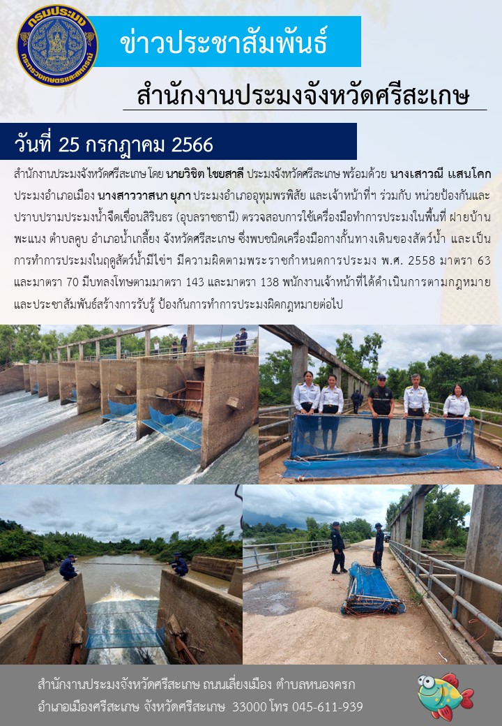 สำนักงานประมงจังหวัดศรีสะเกษ โดยนายวิชิต ไชยสาลี ประมงจังหวัดศรีสะเกษ พร้อมด้วยนางเสาวณี แสนโคก ประมงอำเภอเมือง นางสาววาสนา ยุภา ประมงอำเภออุทุมพรพิสัย และเจ้าหน้าที่ฯ ร่วมกับ หน่วยป้องกันและปราบปรามประมงน้ำจืดเขื่อนสิรินธร (อุบลราชธานี) ตรวจสอบการใช้เครื่องมือทำการประมง ในพื้นที่ ฝายบ้านพะแนง ตำบลคูบ อำเภอน้ำเกลี้ยง จังหวัดศรีสะเกษ ซึ่งพบชนิดเครื่องมือกางกั้นทางเดินของสัตว์น้ำ และเป็นการทำการประมงในฤดูสัตว์น้ำมีไข่ฯ มีความผิดตามพระราชกำหนดการประมง พ.ศ. 2558 มาตรา 63 และ มาตรา 70 มีบทลงโทษตามมาตรา143 และมาตรา 138 พนักงานเจ้าหน้าที่ได้ดำเนินการตามกฎหมาย และประชาสัมพันธ์สร้างการรับรู้ ป้องกันการทำการประมงผิดกฎหมายต่อไป