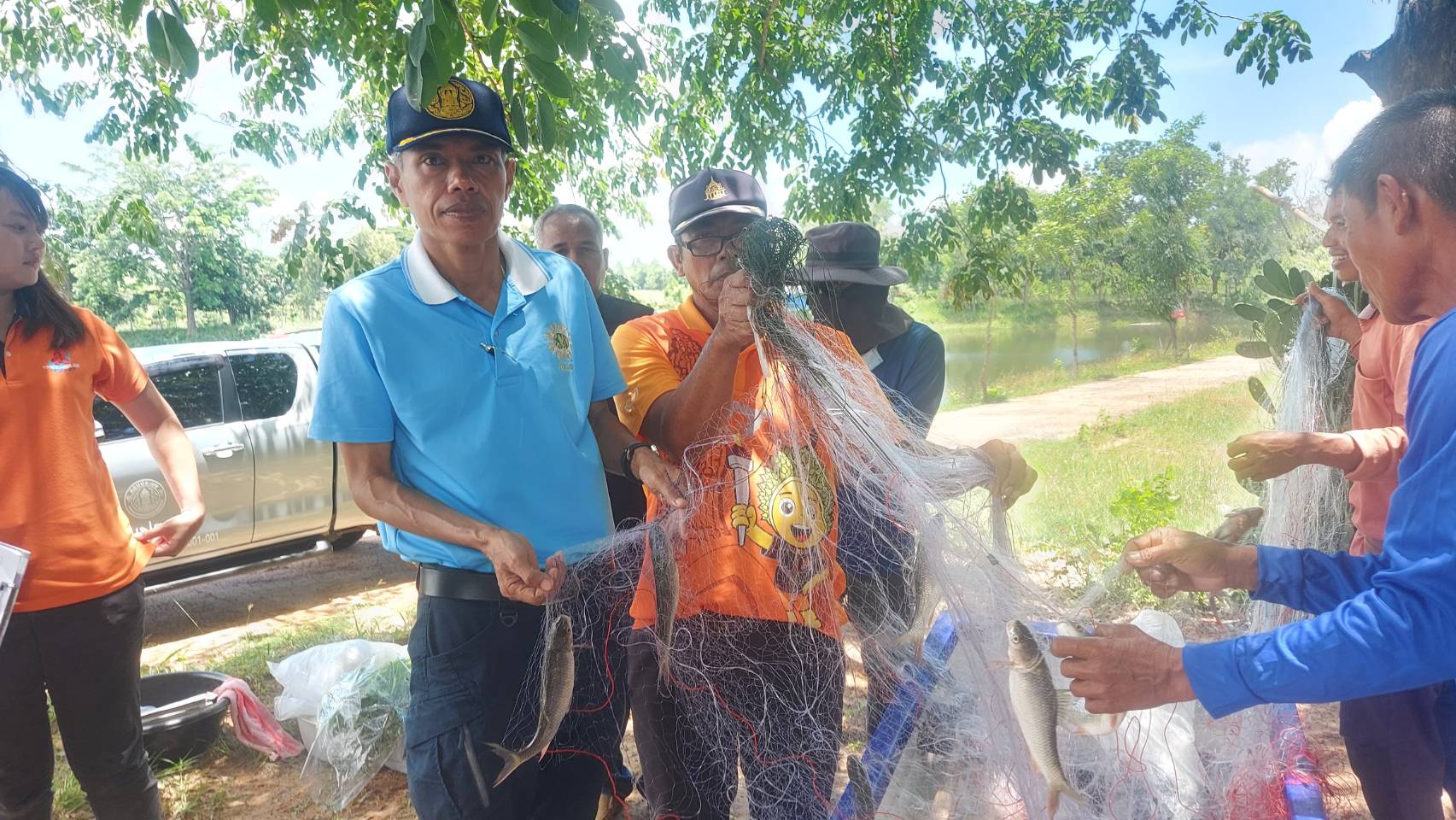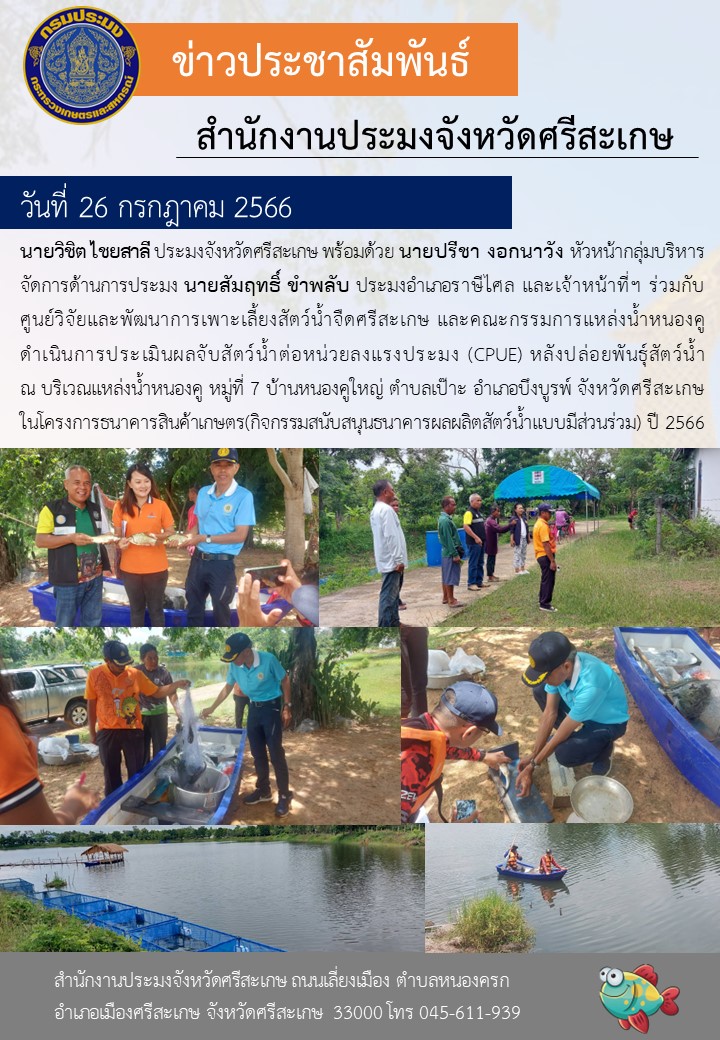 นายวิชิต ไชยสาลี ประมงจังหวัดศรีสะเกษ พร้อมด้วย นายปรีชา งอกนาวัง หัวหน้ากลุ่มบริหารจัดการด้านการประมง นายสัมฤทธิ์ ขำพลับ ประมงอำเภอราษีไศล และเจ้าหน้าที่ฯ ร่วมกับศูนย์วิจัยและพัฒนาการเพาะเลี้ยงสัตว์น้ำจืดศรีสะเกษ และคณะกรรมการแหล่งน้ำหนองคู ดำเนินการประเมินผลจับสัตว์น้ำต่อหน่วยลงแรงประมง (CPUE) หลังปล่อยพันธุ์สัตว์น้ำ ณ บริเวณแหล่งน้ำหนองคู หมู่ที่ 7 บ้านหนองคูใหญ่ ตำบลเป๊าะ อำเภอบึงบูรพ์ จังหวัดศรีสะเกษ ในโครงการธนาคารสินค้าเกษตร(กิจกรรมสนับสนุนธนาคารผลผลิตสัตว์น้ำแบบมีส่วนร่วม) ปี 2566