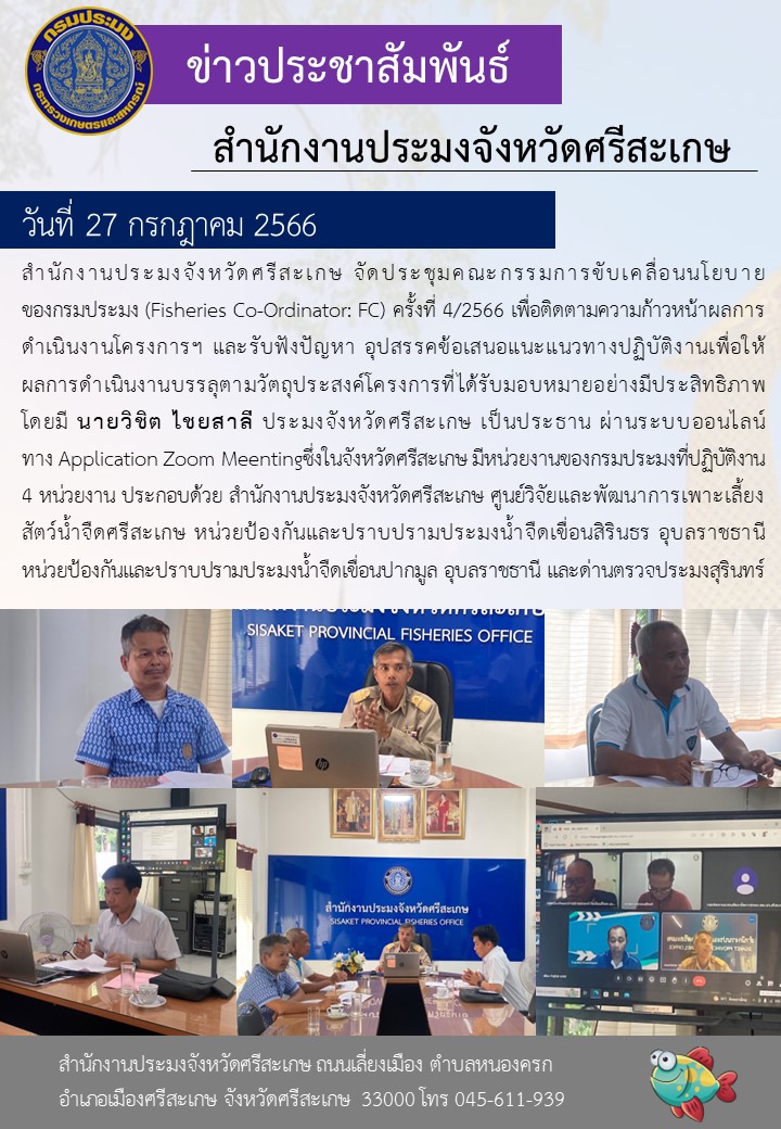สำนักงานประมงจังหวัดศรีสะเกษ จัดประชุมคณะกรรมการขับเคลื่อนนโยบายของกรมประมง (Fisheries Co-Ordinator: FC) ครั้งที่ 4/2566 เพื่อติดตามความก้าวหน้าผลการดำเนินงานโครงการฯ และรับฟังปัญหา อุปสรรคข้อเสนอแนะแนวทางปฏิบัติงานเพื่อให้ผลการดำเนินงานบรรลุตามวัตถุประสงค์โครงการที่ได้รับมอบหมายอย่างมีประสิทธิภาพ โดยมี นายวิชิต ไชยสาลี ประมงจังหวัดศรีสะเกษ เป็นประธาน ผ่านระบบออนไลน์ ทาง Application Zoom Meentingซึ่งในจังหวัดศรีสะเกษ มีหน่วยงานของกรมประมงที่ปฏิบัติงาน 4 หน่วยงาน ประกอบด้วย สำนักงานประมงจังหวัดศรีสะเกษ ศูนย์วิจัยและพัฒนาการเพาะเลี้ยงสัตว์น้ำจืดศรีสะเกษ หน่วยป้องกันและปราบปรามประมงน้ำจืดเขื่อนสิรินธร อุบลราชธานี หน่วยป้องกันและปราบปรามประมงน้ำจืดเขื่อนปากมูล อุบลราชธานี และด่านตรวจประมงสุรินทร์